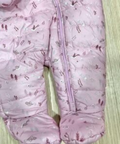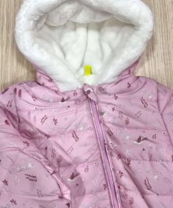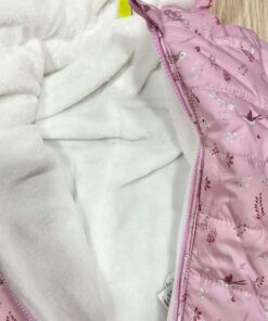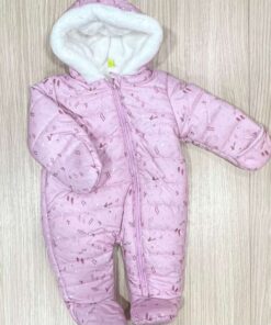 Tutone neonata con interno in ecopelliccia, di colore rosa e bianco, con disegni di vari colori e con dettaglio di cerniera estesa per poterlo indossare facilmente.