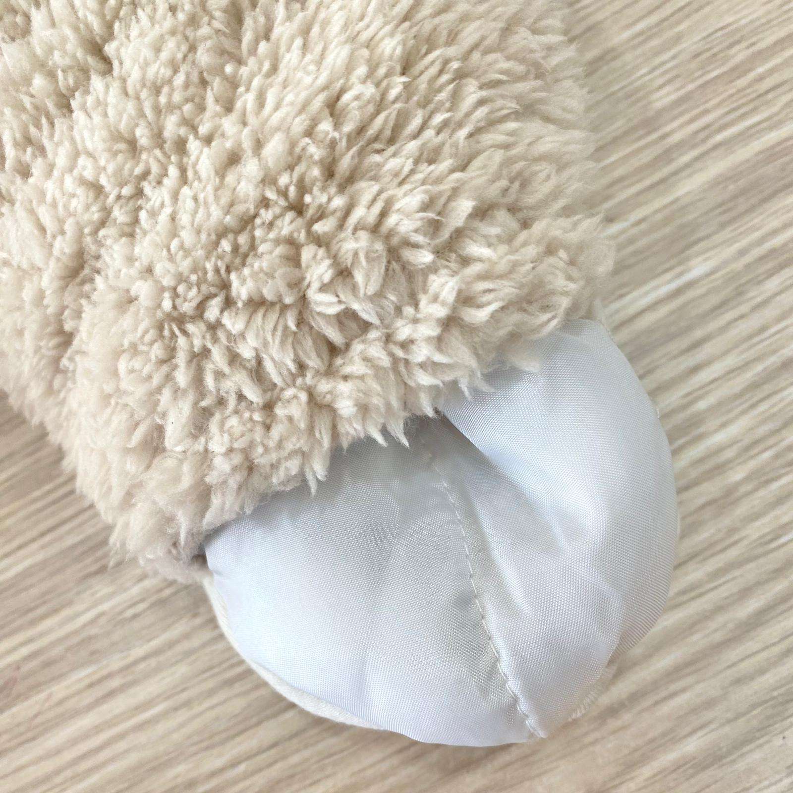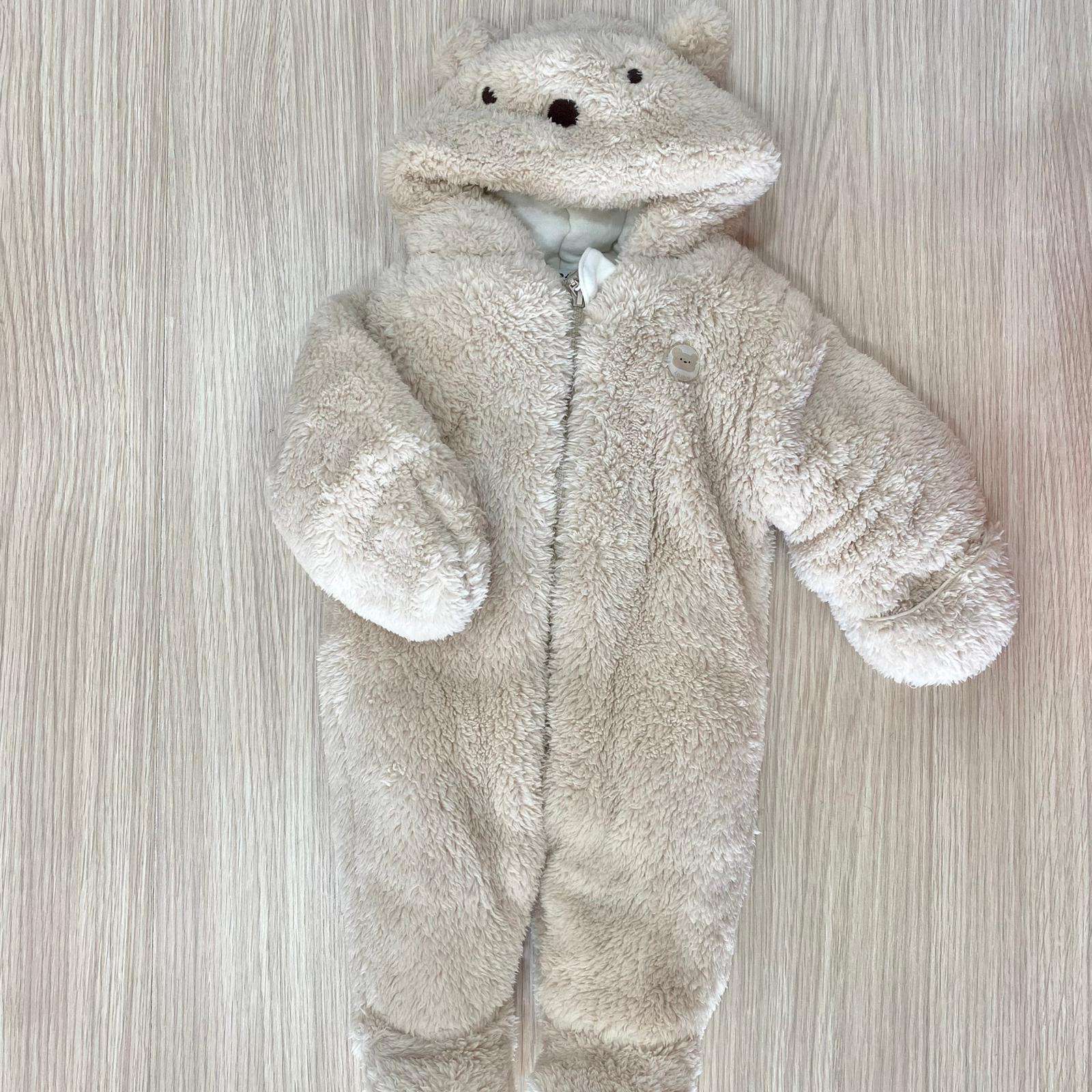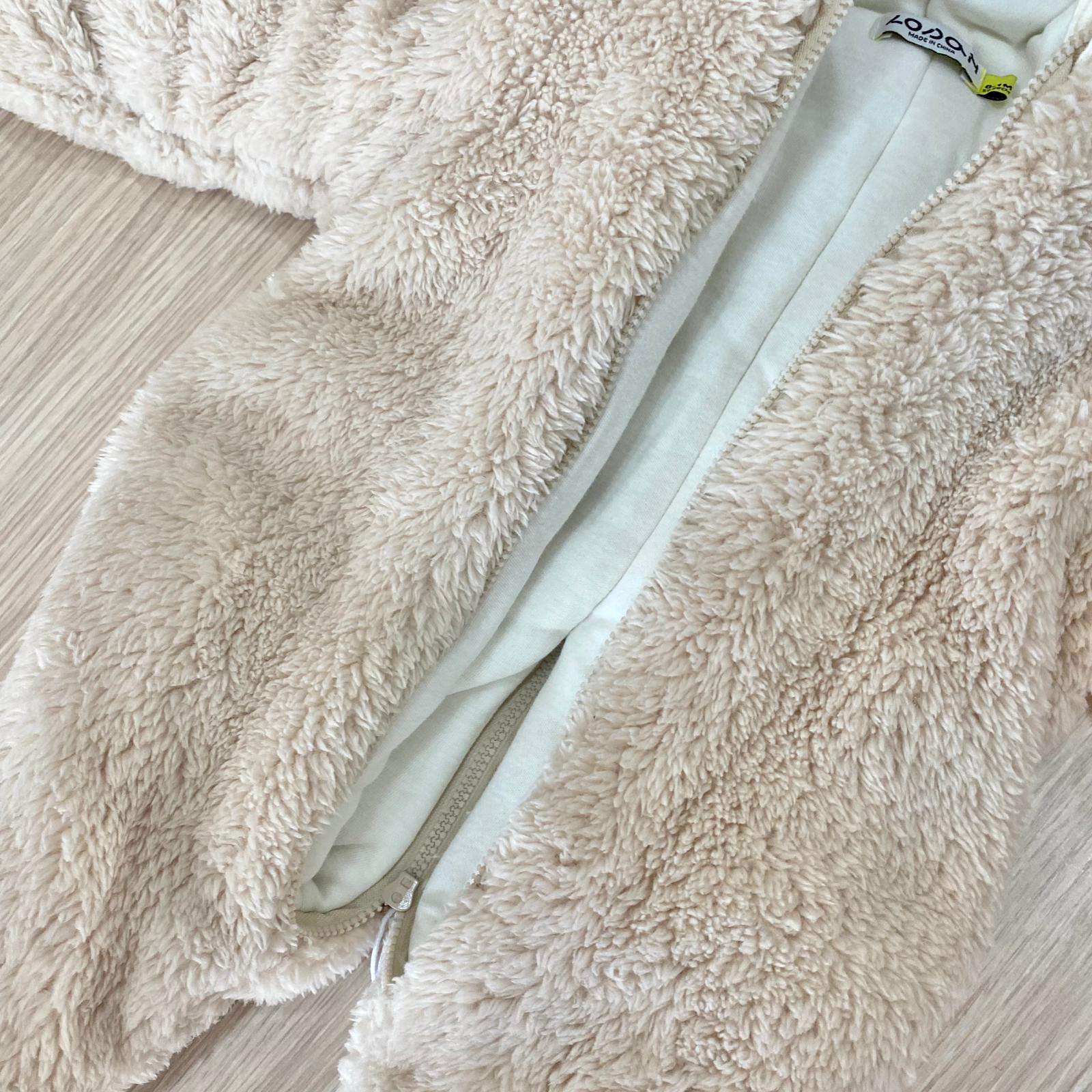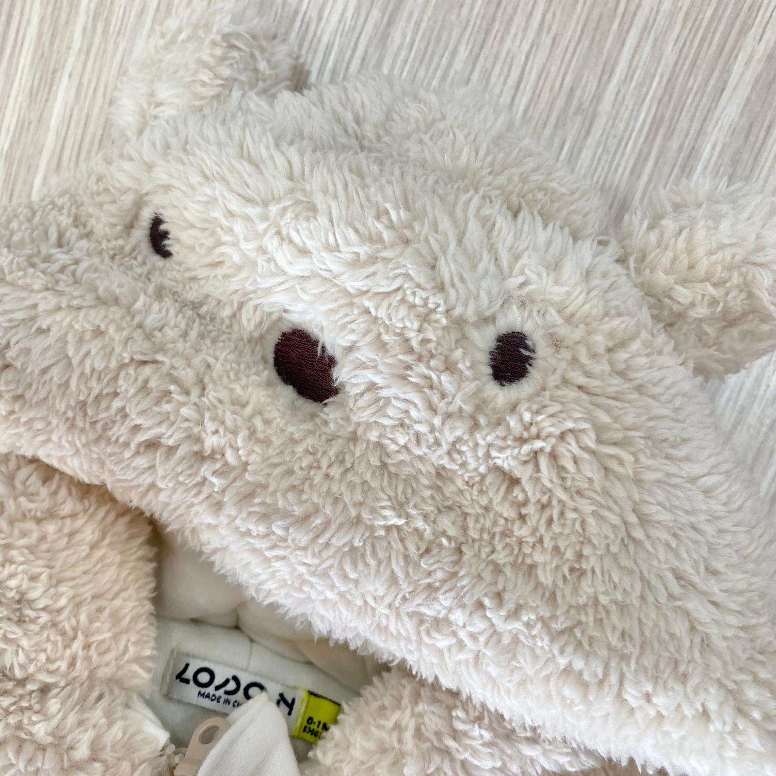 Tutone termico neonato/a in ecopelliccia, con interno in caldo cotone, di colore beige e panna, con dettaglio di cerniera estesa sul retro per indossarlo facilmente.
