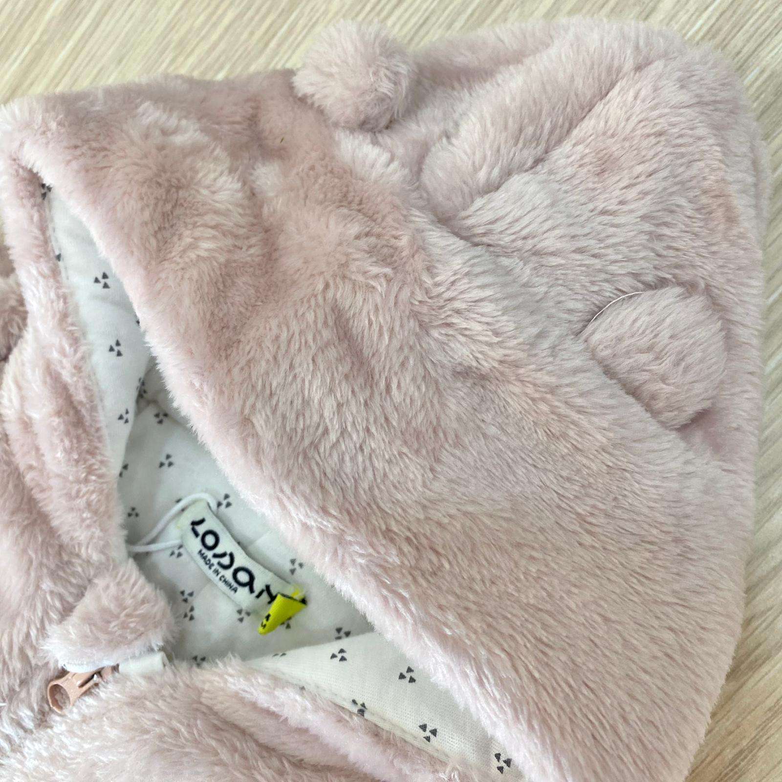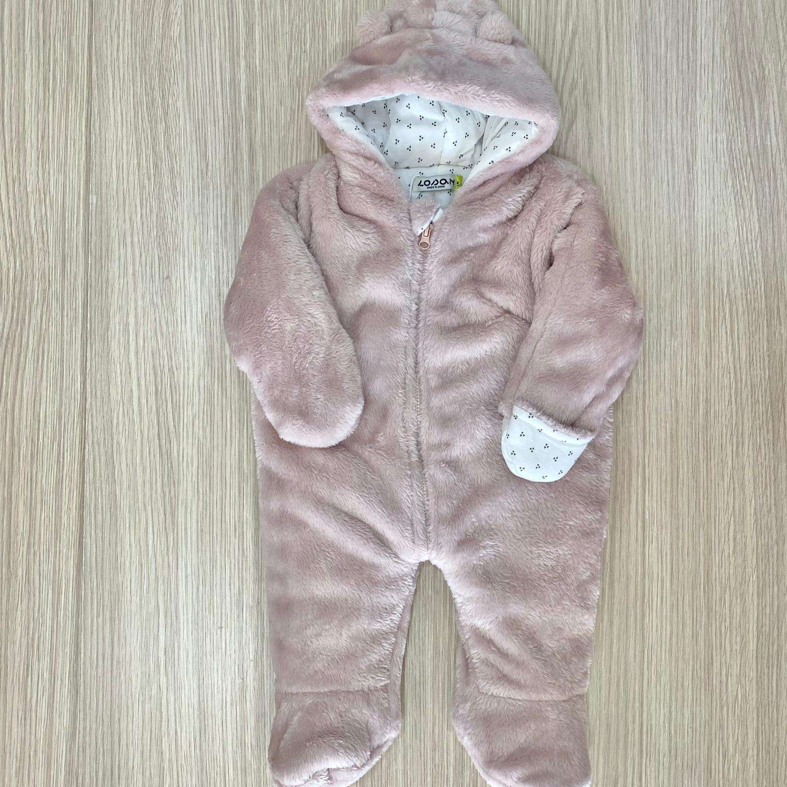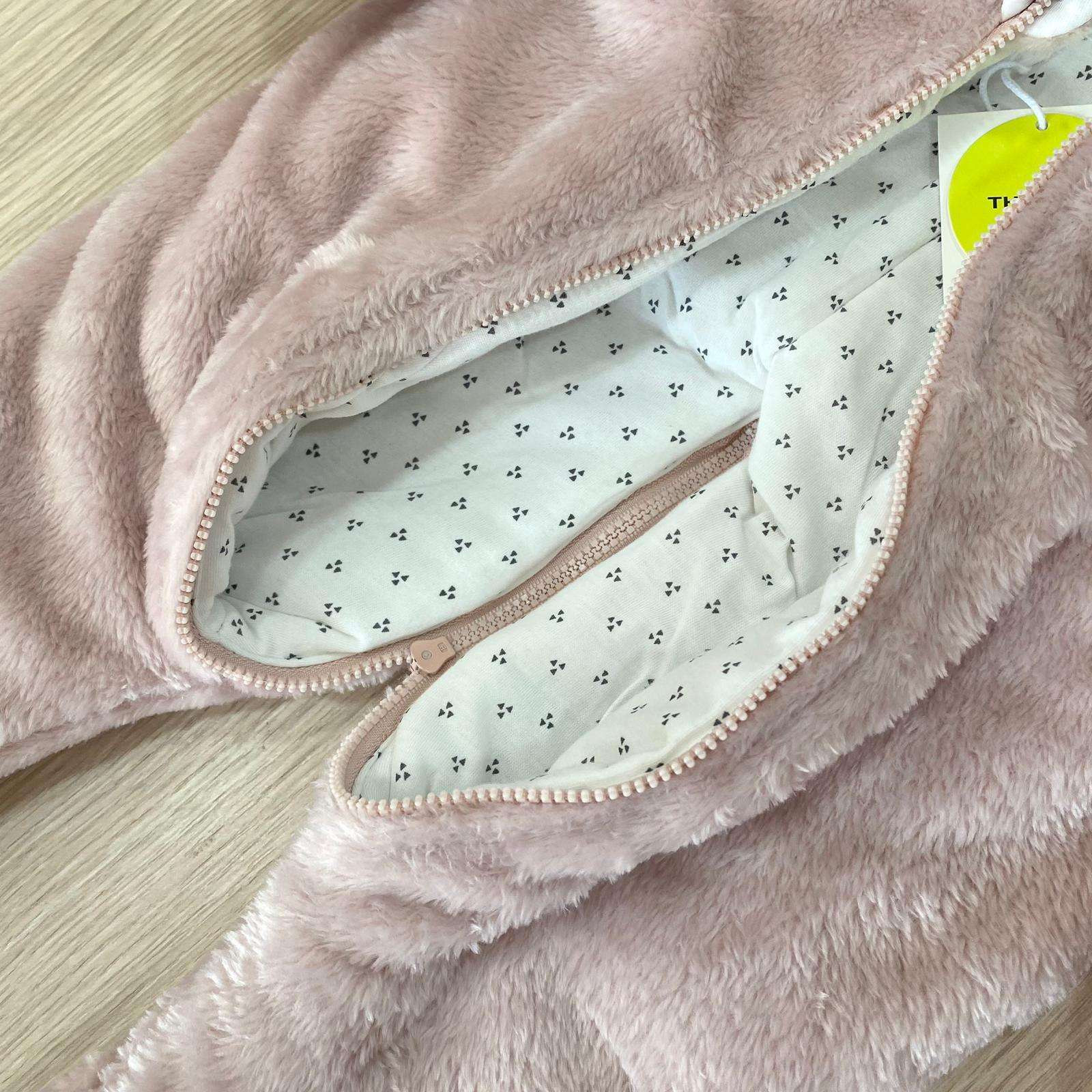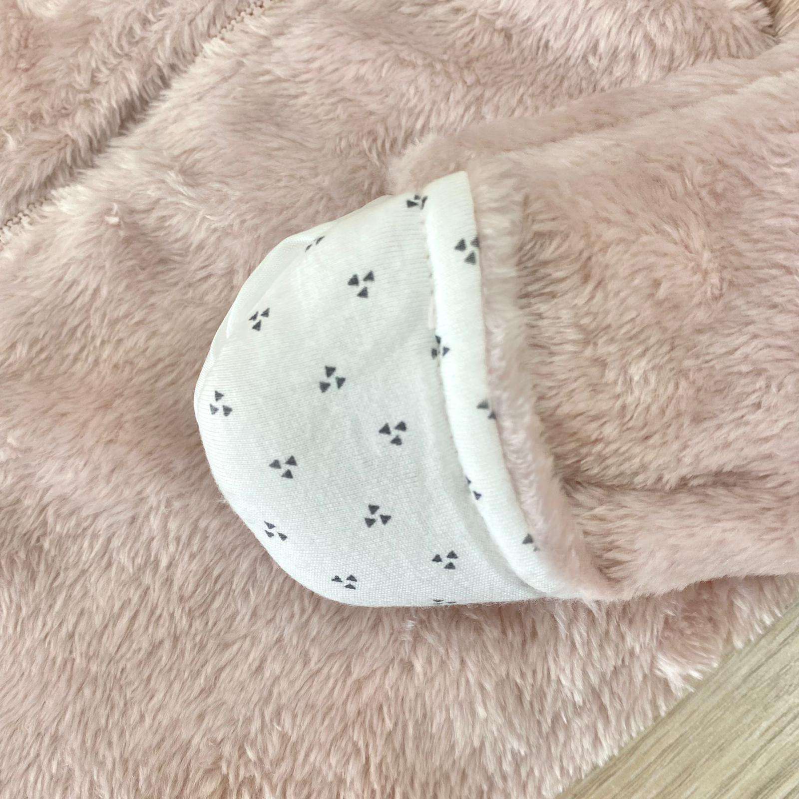 Tutone termico neonata in ecopelliccia, con interno in caldo cotone, di colore rosa e panna, con dettaglio di cerniera estesa sul retro per indossarlo facilmente.