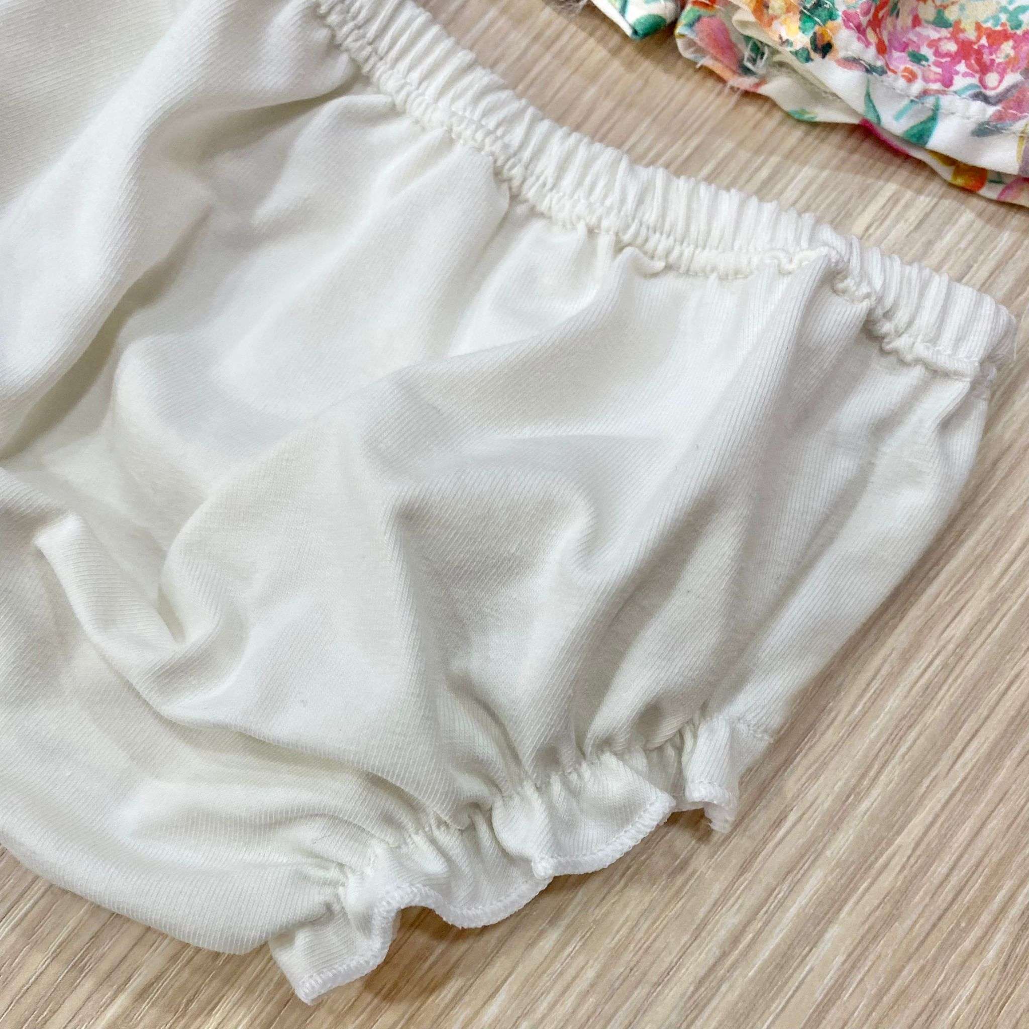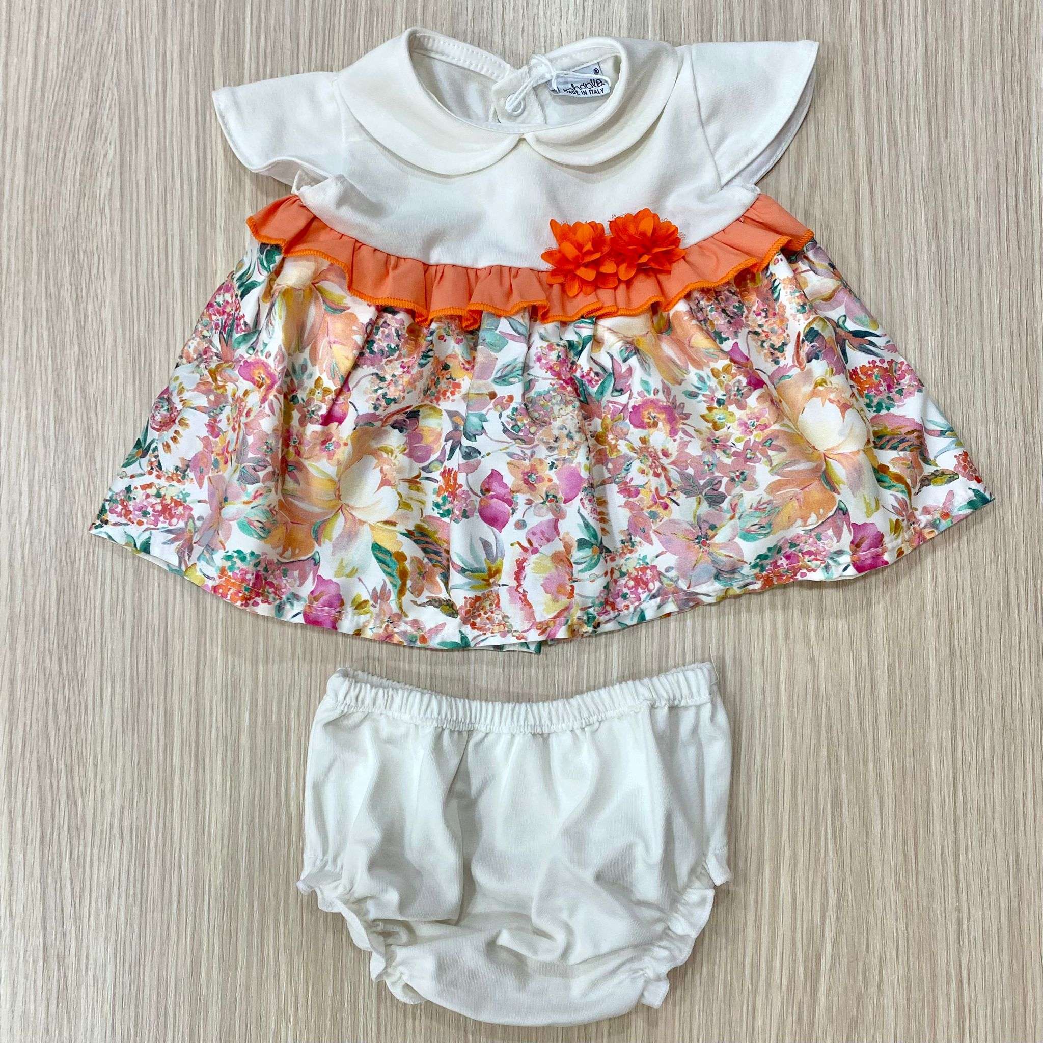 Vestina con copripannolino neonata in cotone, di colore panna e arancione, con disegni di vari colori e applicazione di fiorellini in organza.