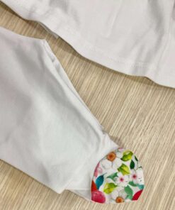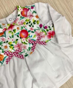 Vestina due pezzi neonata in cotone, di colore bianco con dettagli floreali di vari colori.