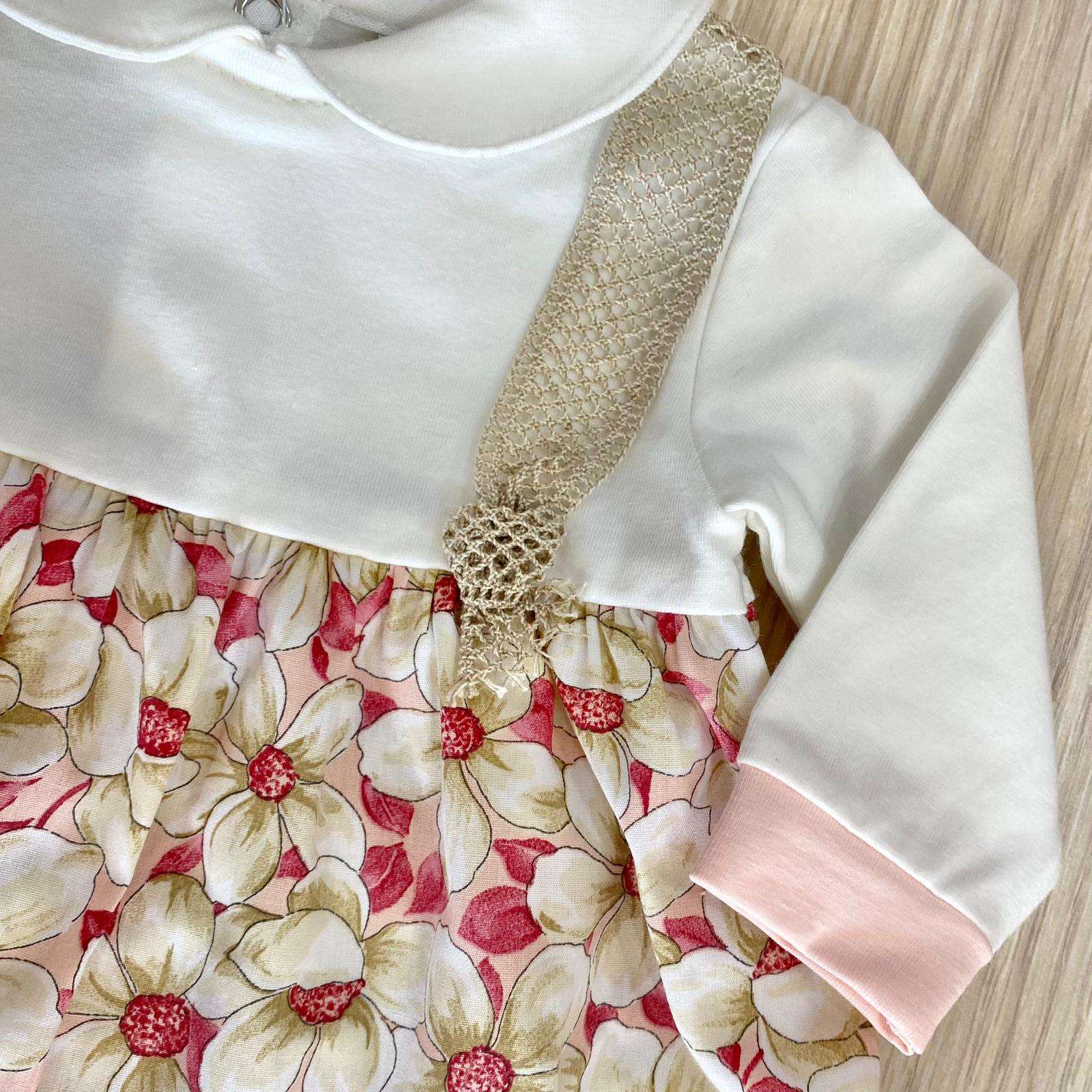 Vestina due pezzi neonata in cotone, di colore rosso, panna e beige, con dettagli di disegni floreali e applicazione di retina in cotone.
