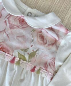 Vestina due pezzi neonata in cotone, di colore panna e fantasia floreale di vari colori.