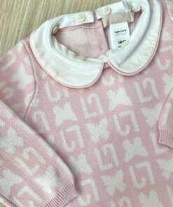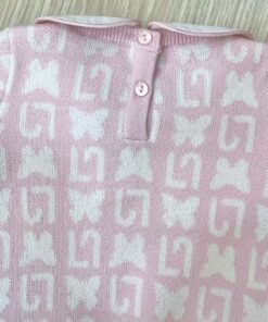 Vestina due pezzi neonata in filo di cotone, di colore rosa e panna, con apertura di bottoncini.