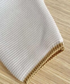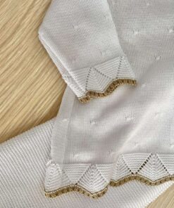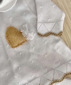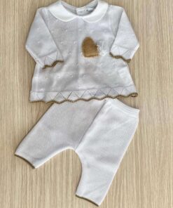Vestina due pezzi neonata, in filo di scozia, di colore bianco e beige, con dettaglio di cuoricino in rilievo.