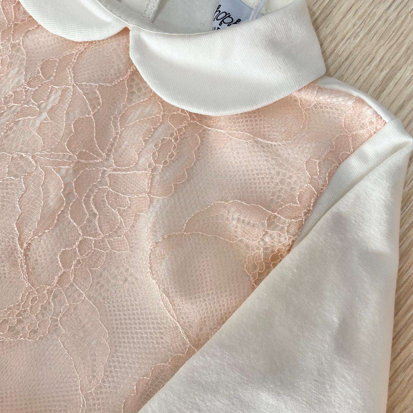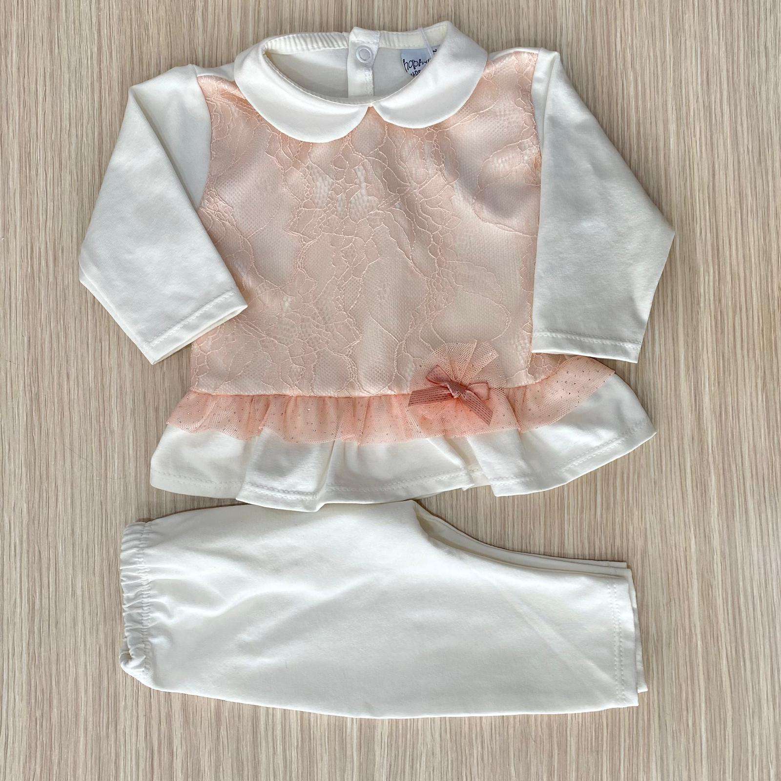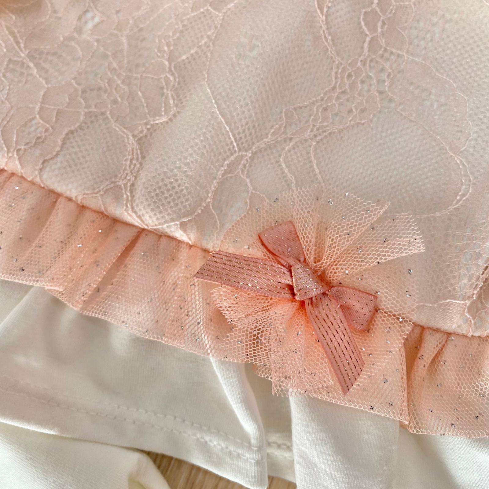 Vestina due pezzi neonata in cotone, di colore panna e rosa, con dettaglio di tulle con pois argentati.