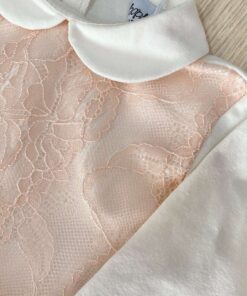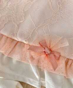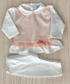 Vestina due pezzi neonata in cotone, di colore panna e rosa, con dettaglio di tulle con pois argentati.