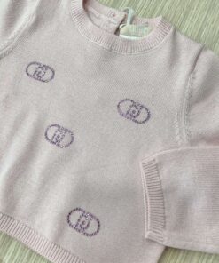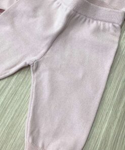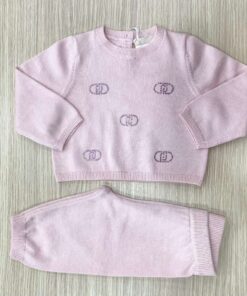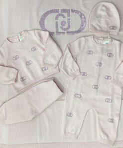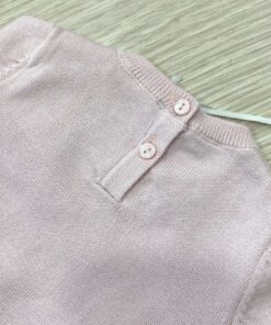 Vestina due pezzi neonata in filo di cotone, di colore rosa, con apertura di bottoncini e applicazione di strass.