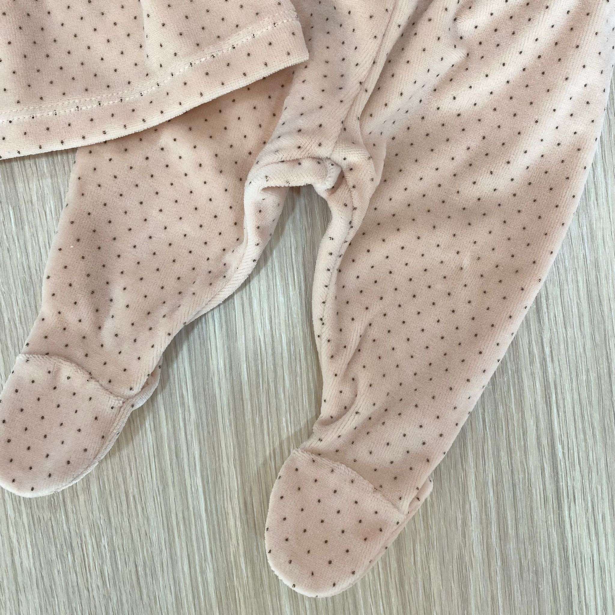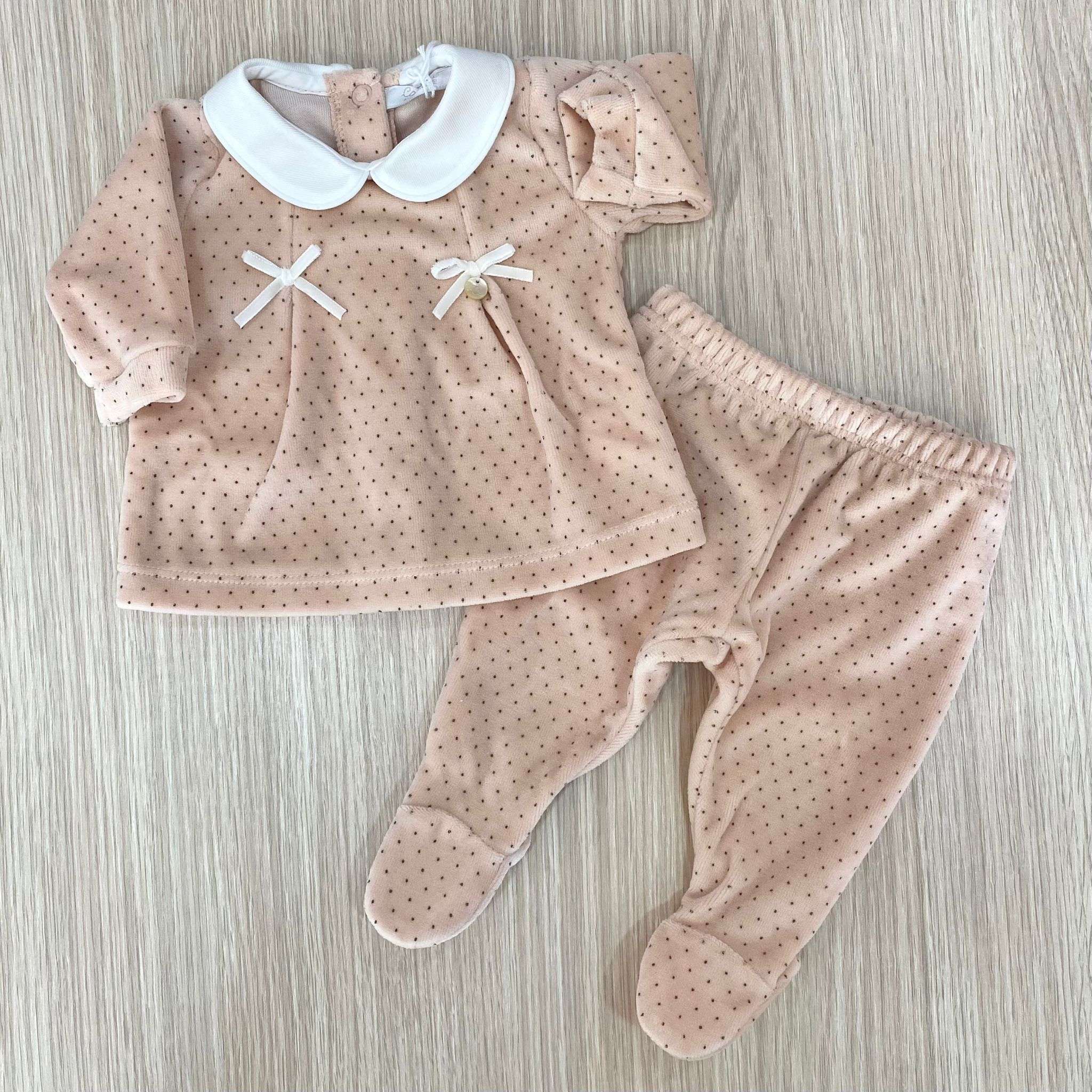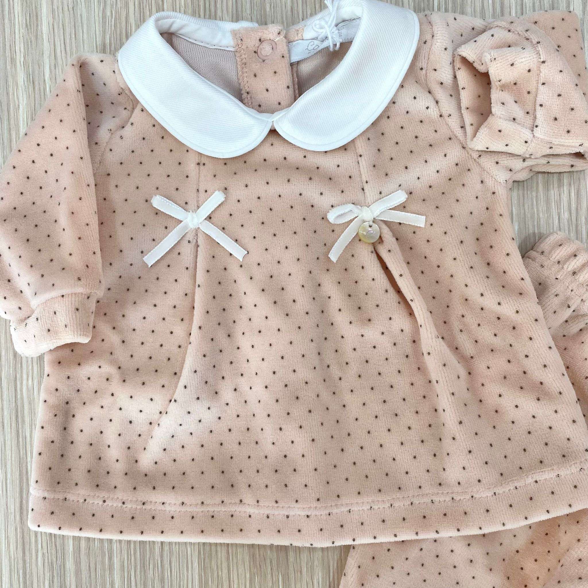 Vestina due pezzi neonata in ciniglia di colore rosa antico e pois di colore marroncino, con applicazione di fiocchetti in velluto, con colletto in caldo cotone.