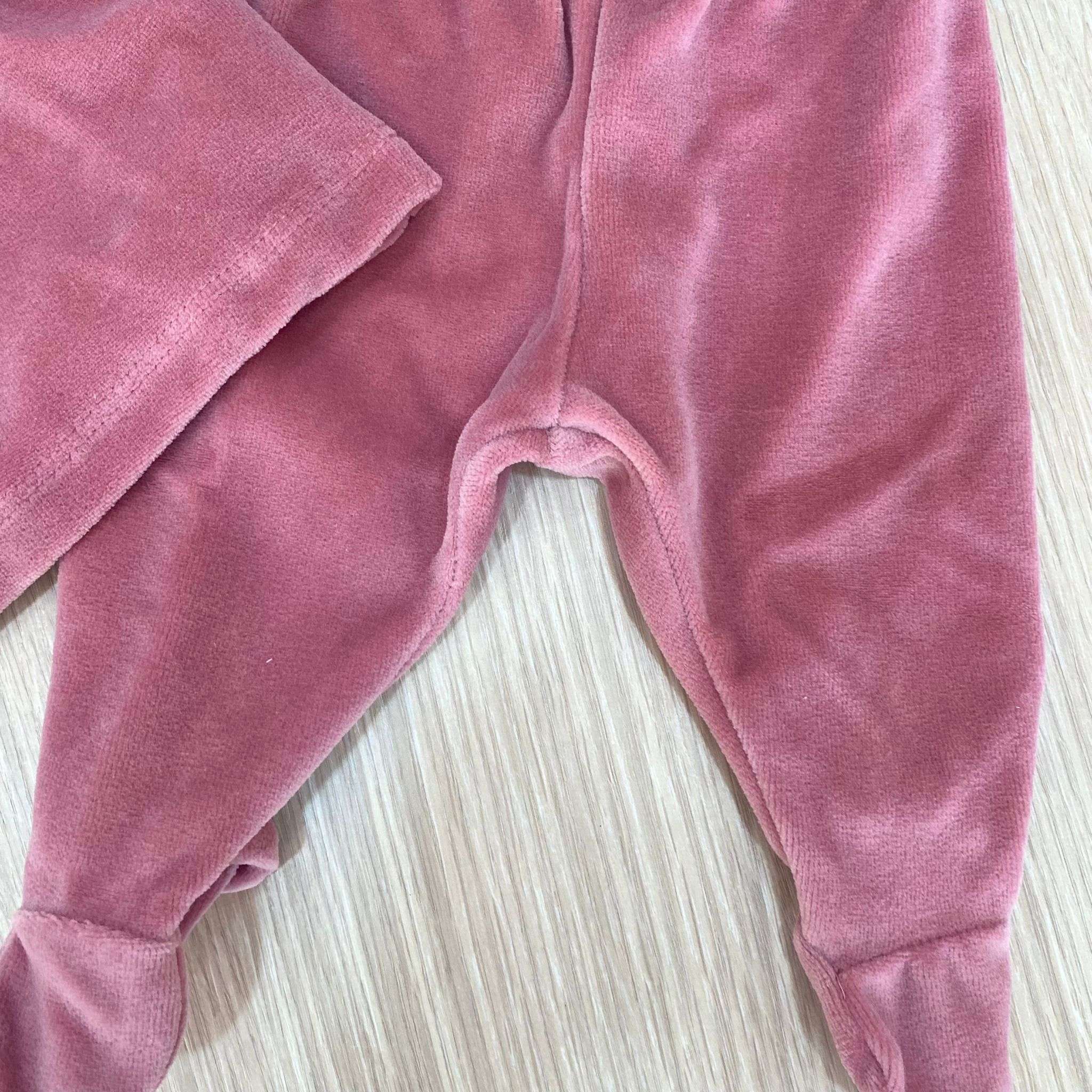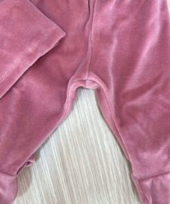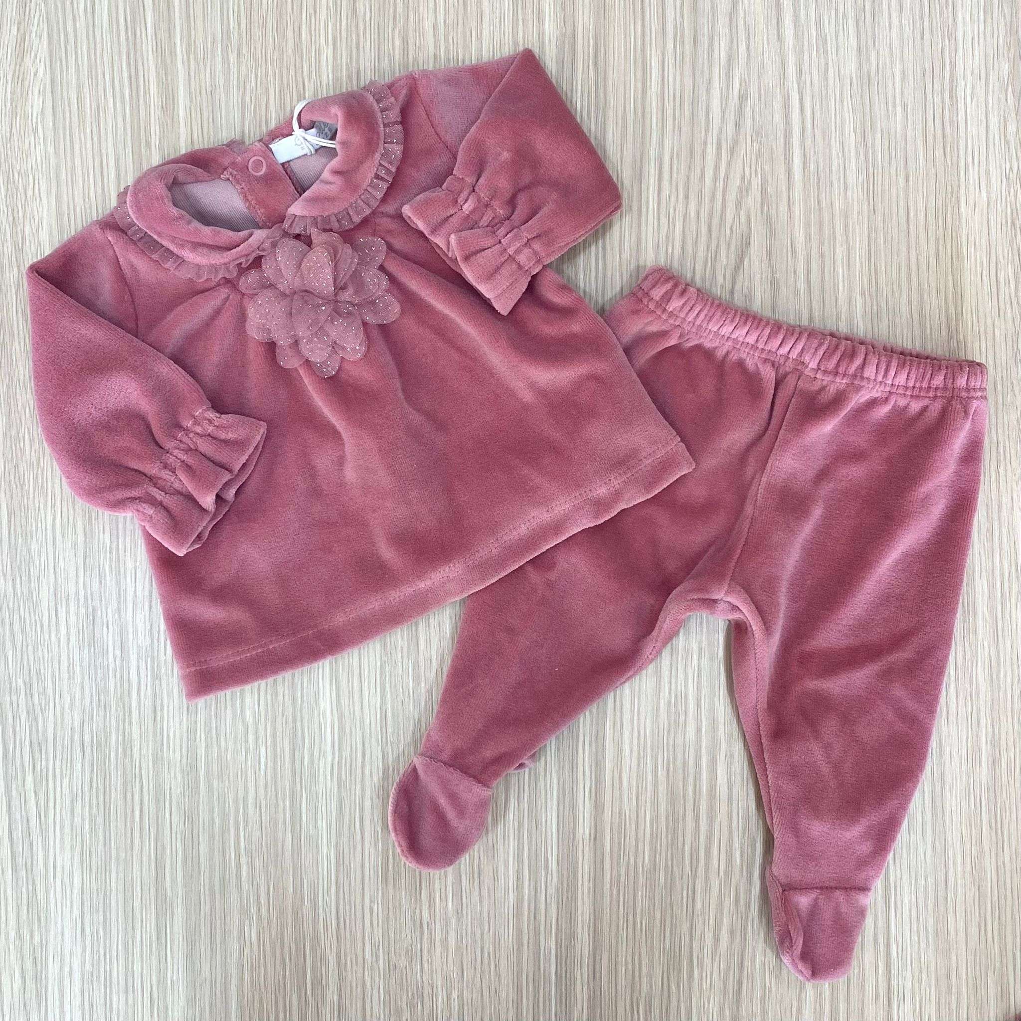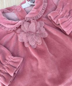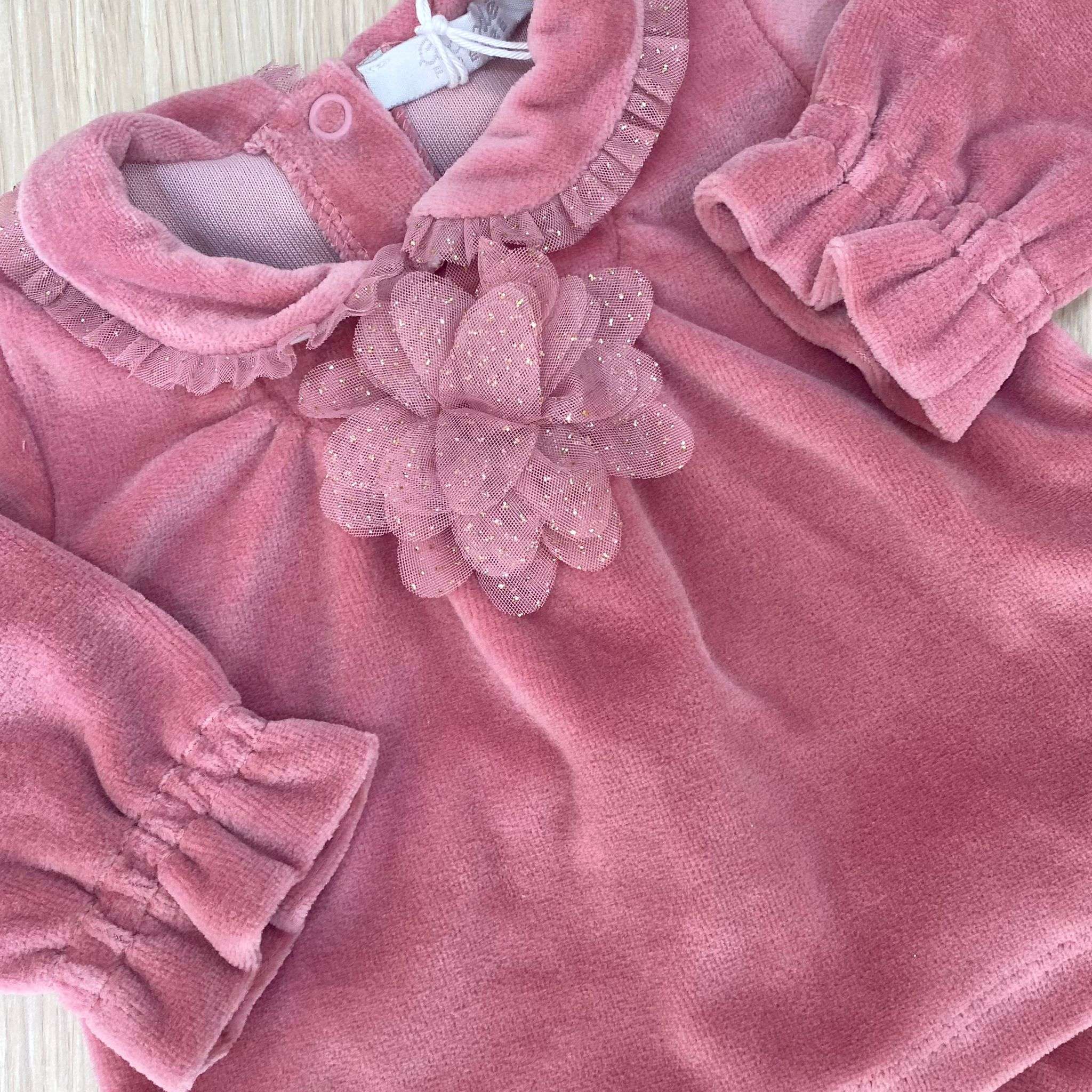 Vestina due pezzi neonata in ciniglia, di colore ortensia, con applicazione in organza e dettagli glitterati.