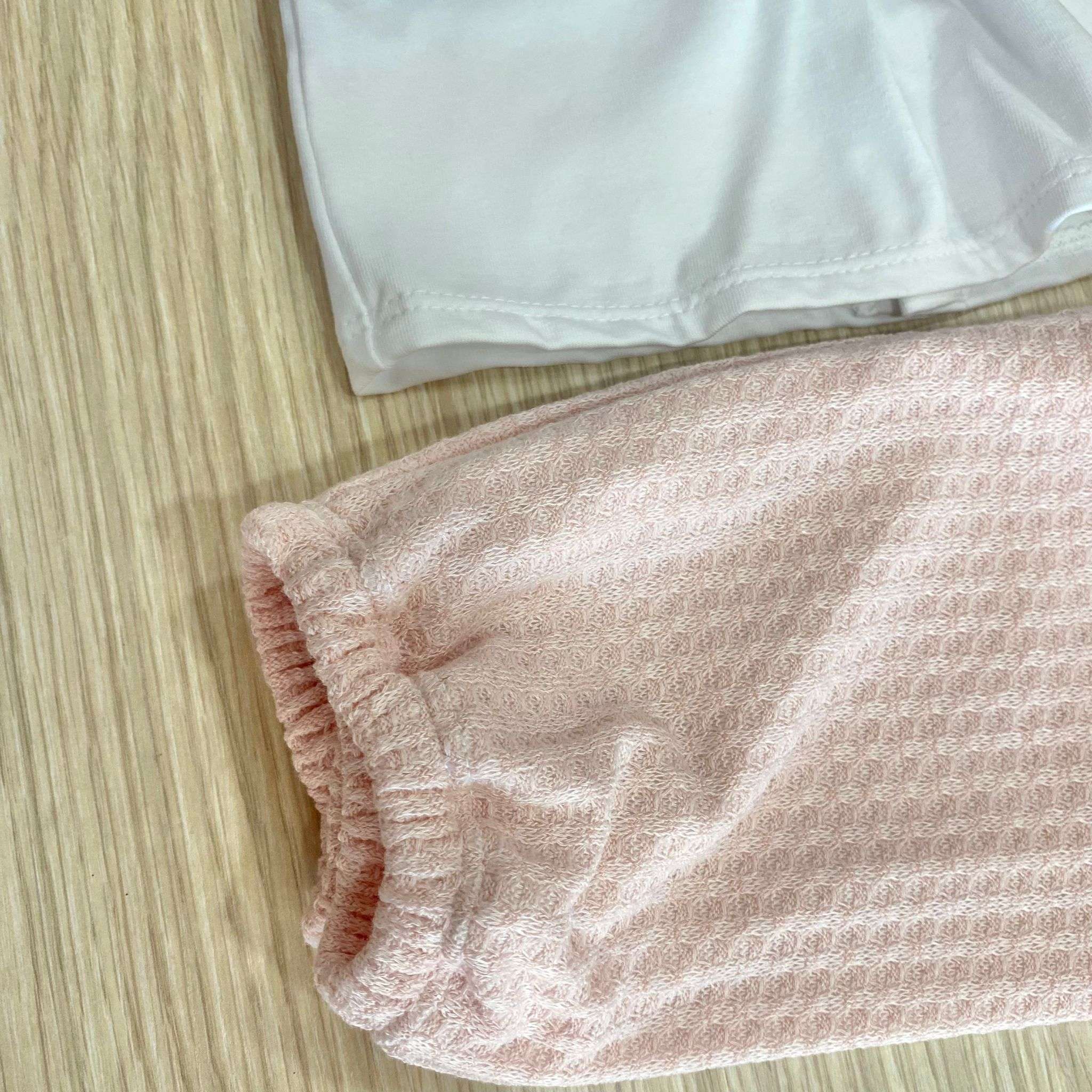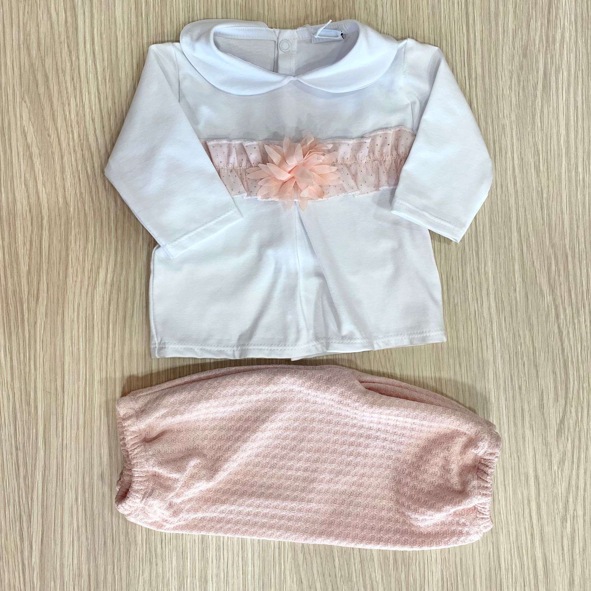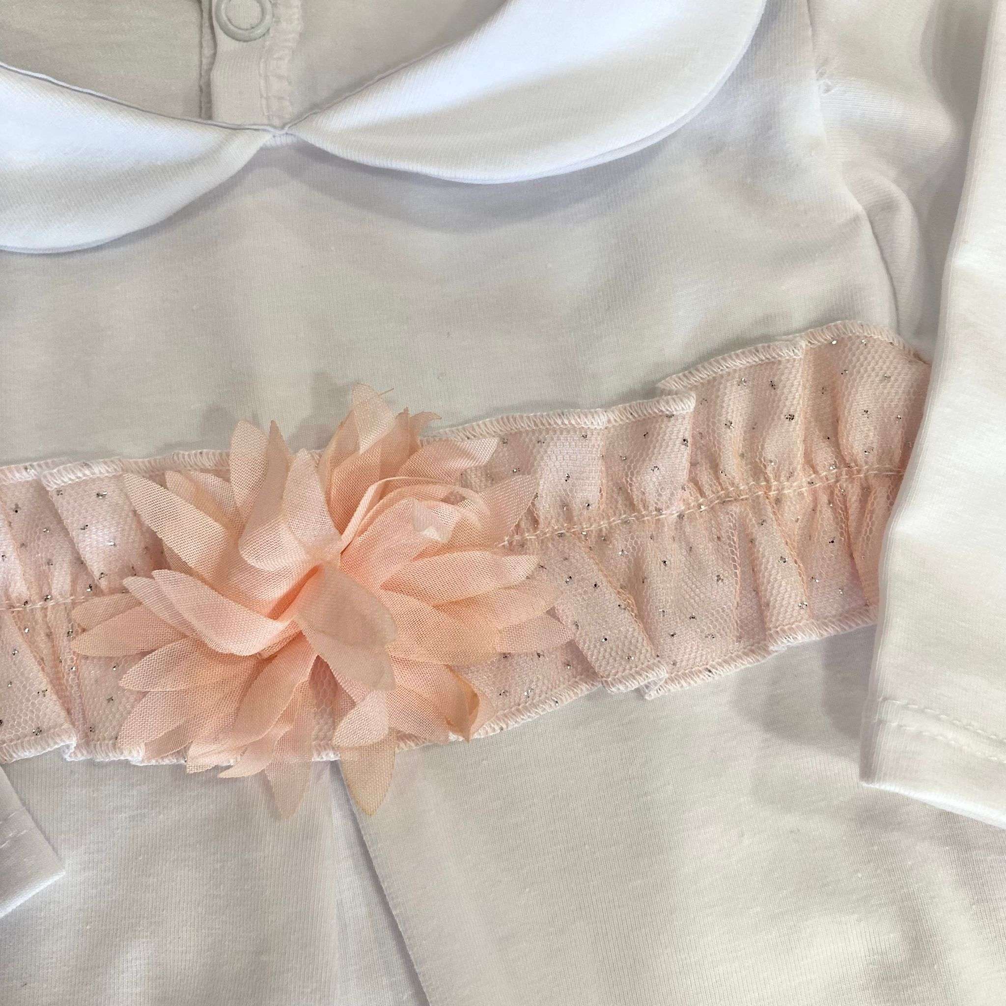 Vestina due pezzi neonata in cotone, di colore bianco e rosa, con applicazione di fiorellini in organza e dettaglio di retina rosa con glitter argento.