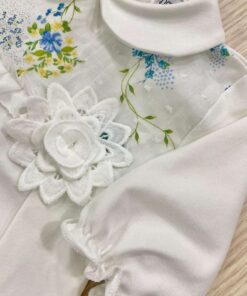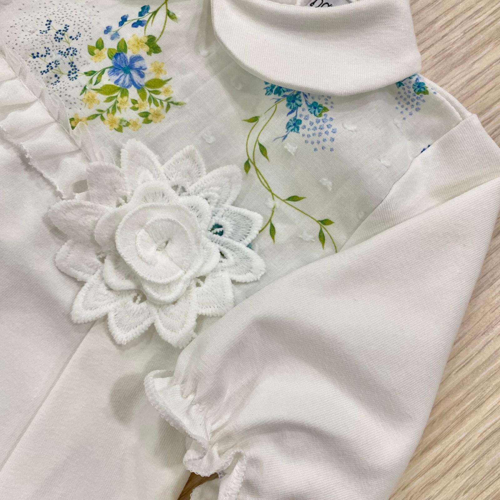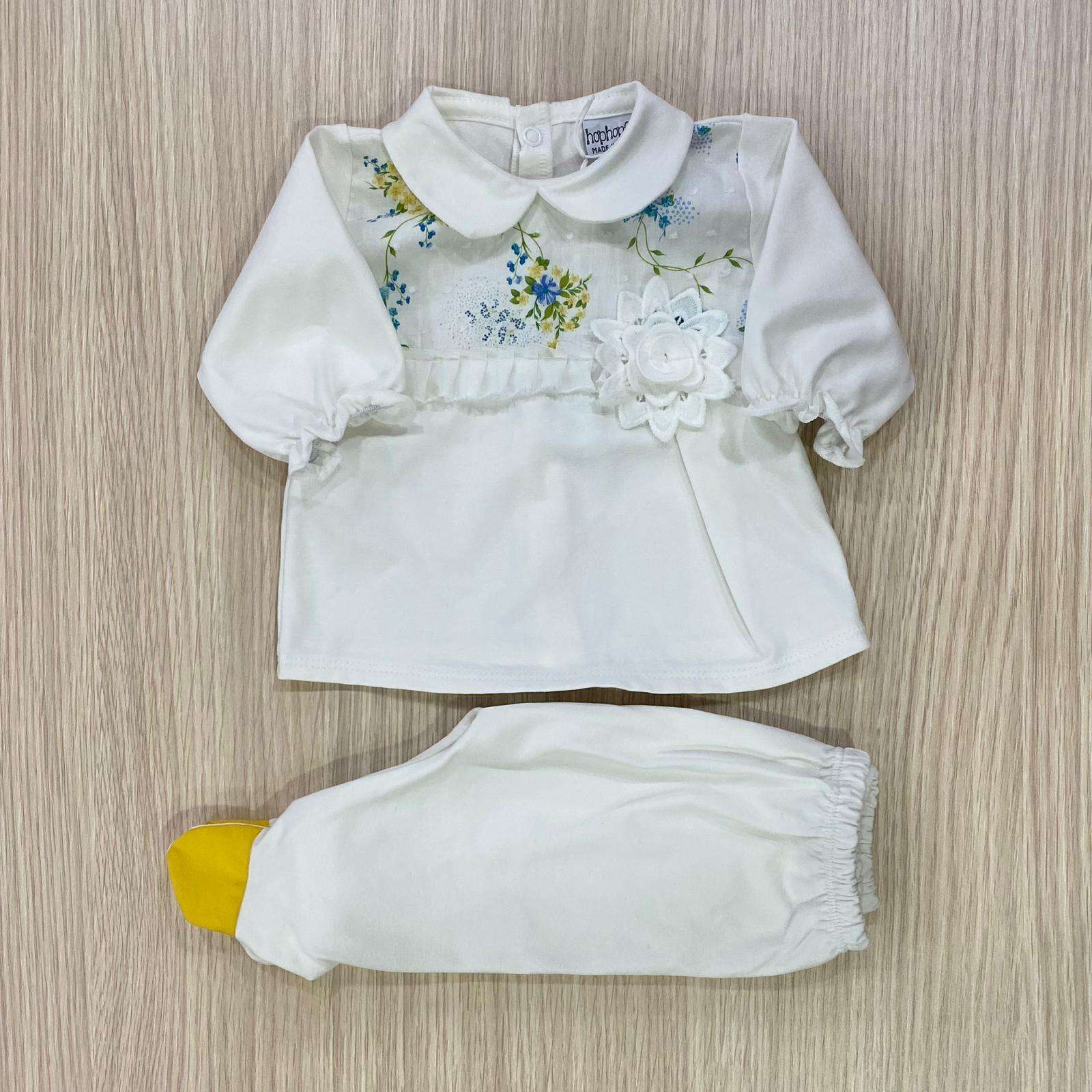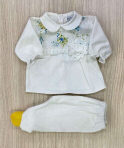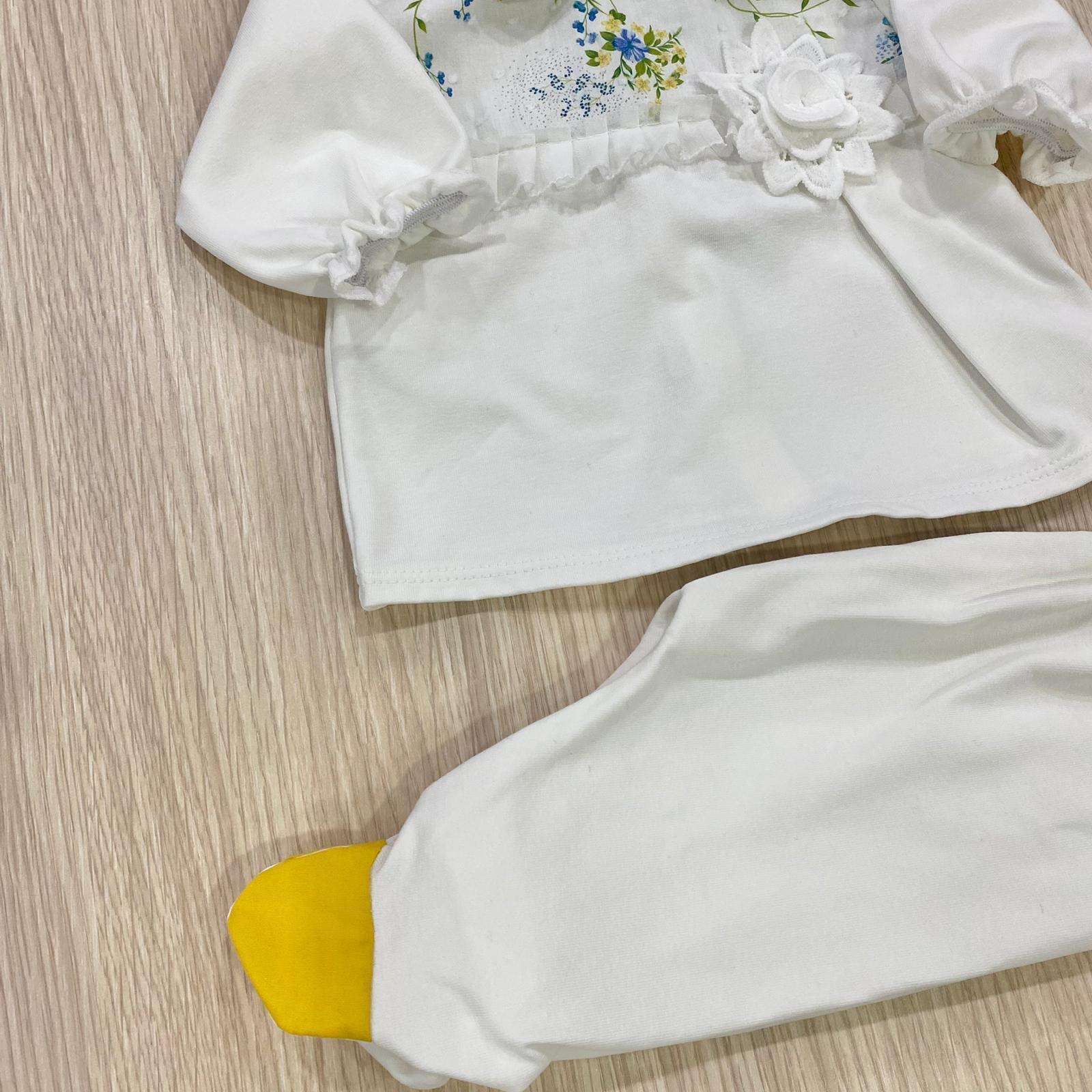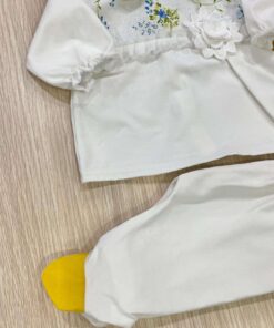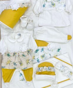 Vestina due pezzi neonata in cotone, di colore panna e senape, con applicazione di veletto in cotone e fiorellino in pizzo sangallo.