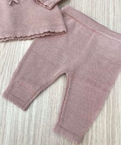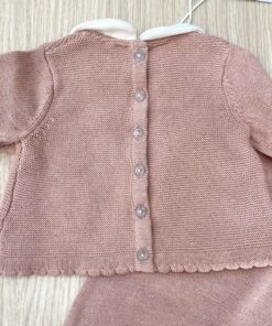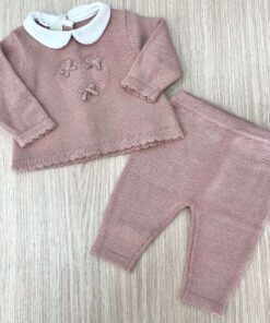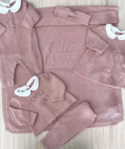 Vestina due pezzi neonata/bambina in caldo cotone, di colore rosa chiaro, con dettaglio di colletto in velluto e applicazione di fiocchetti in tessuto.