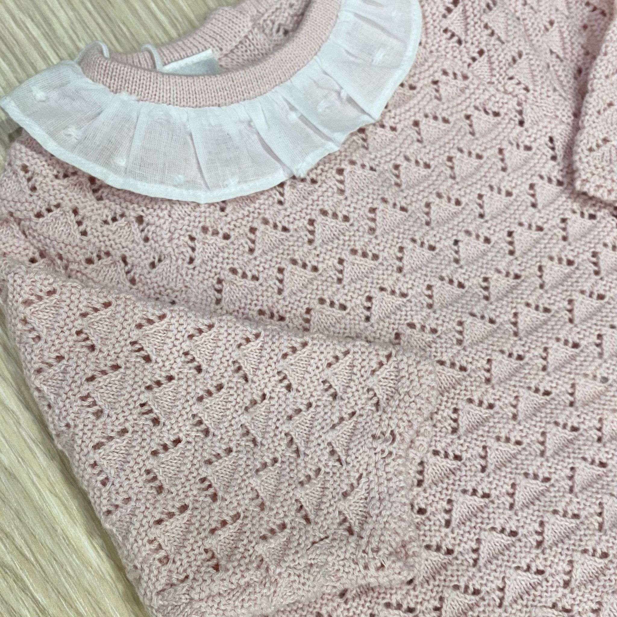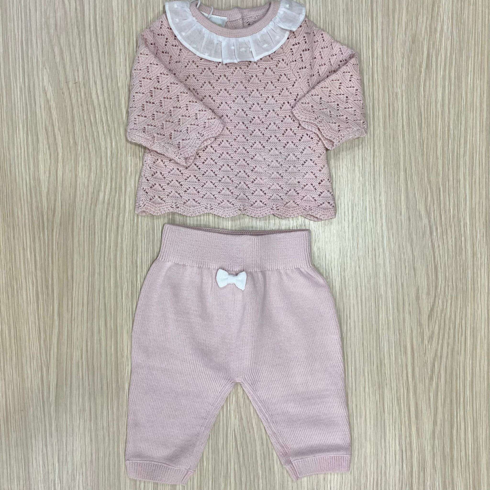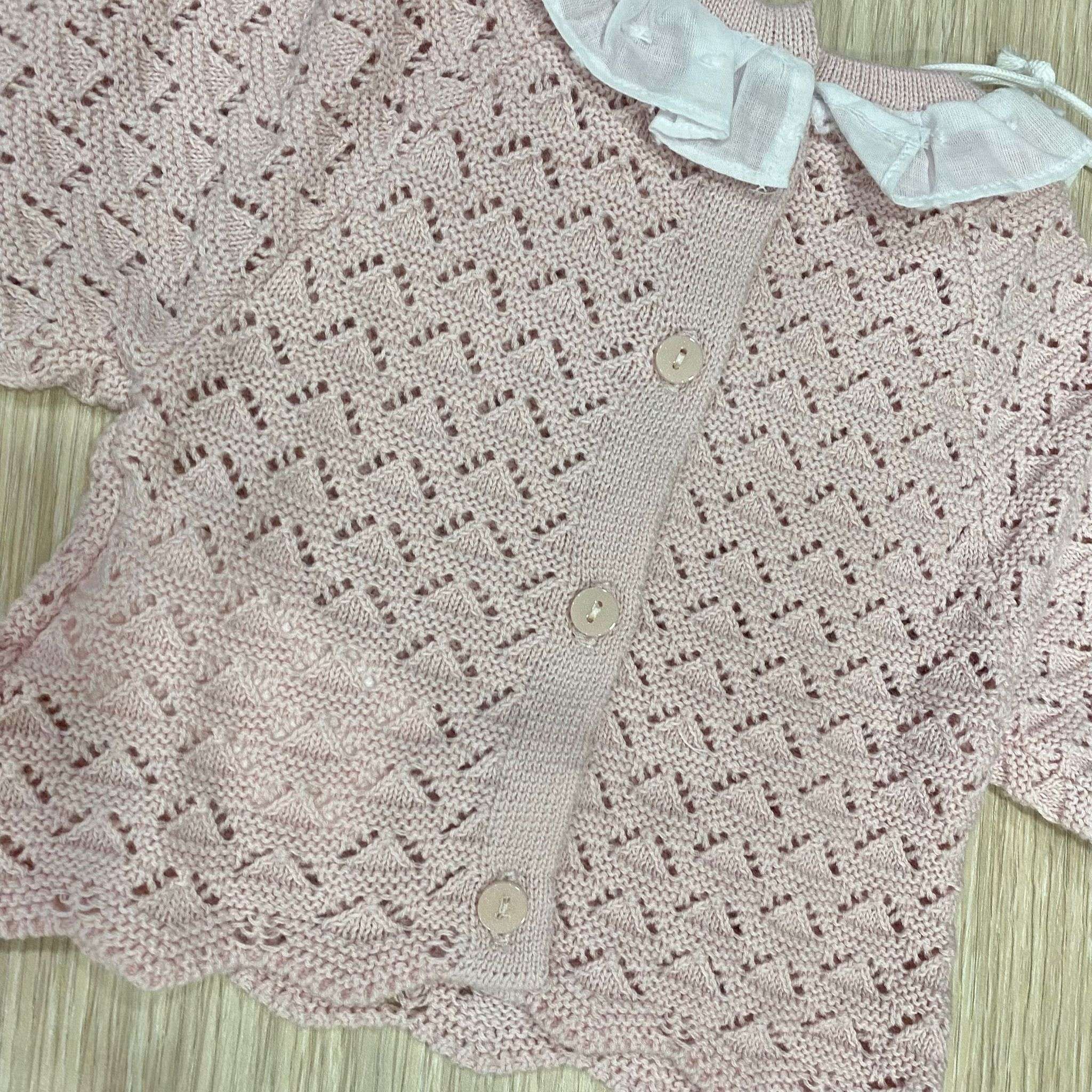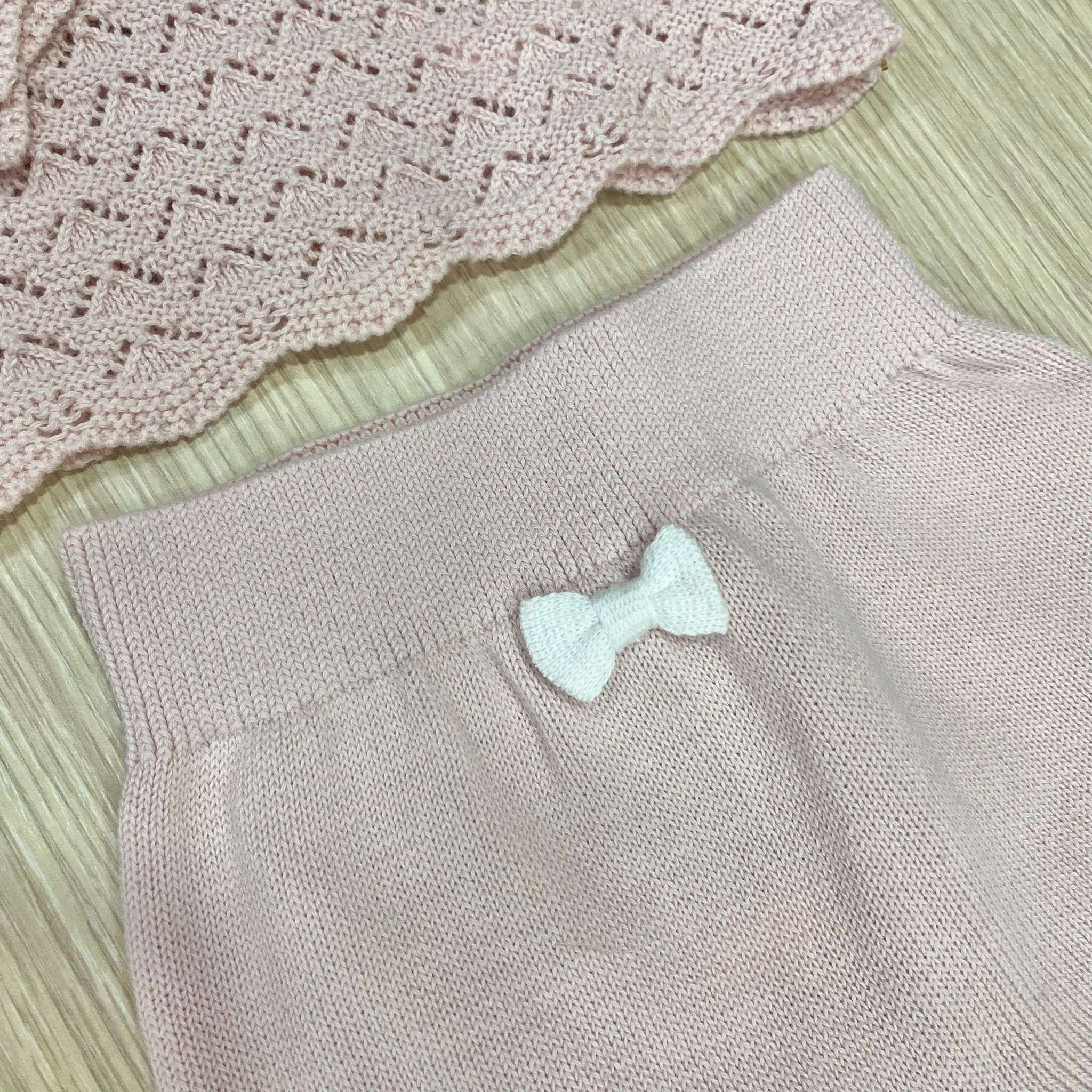 Vestina due pezzi neonata in filo, di colore rosa e bianco, con applicazione di fiocchetto in tessuto.