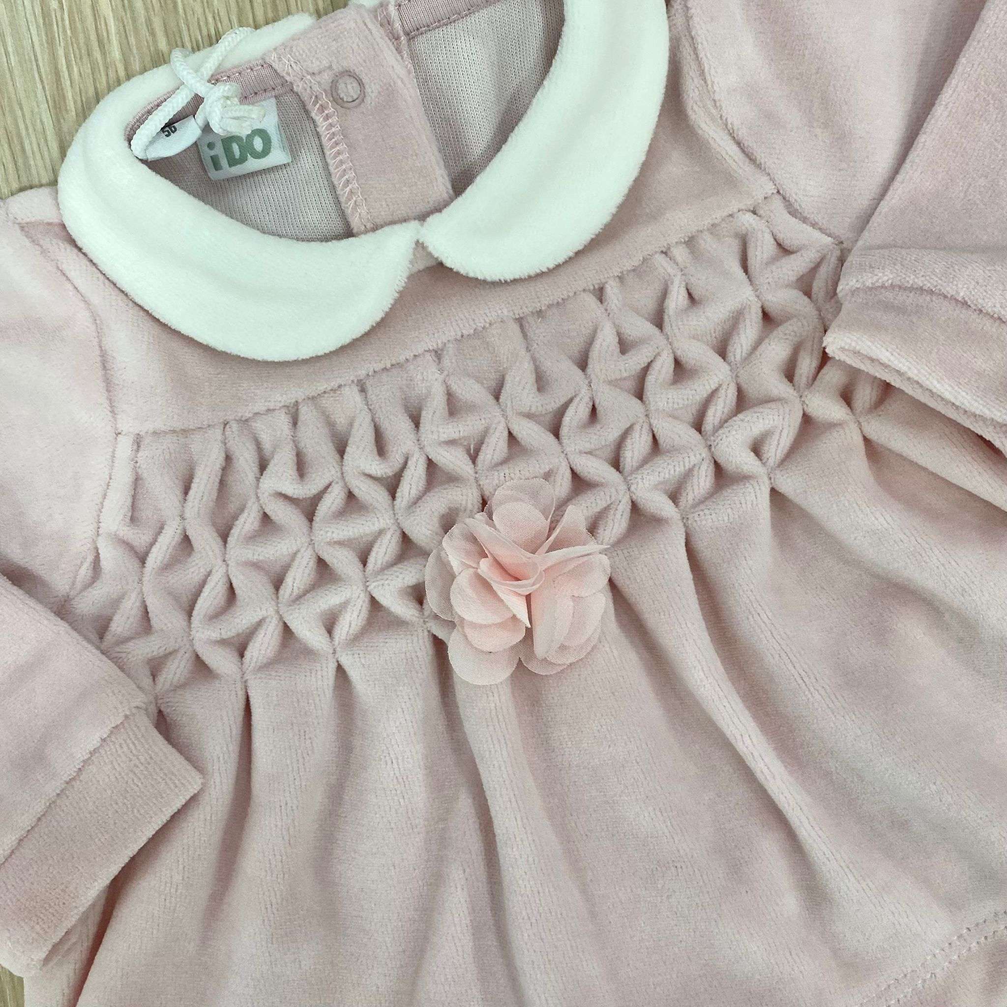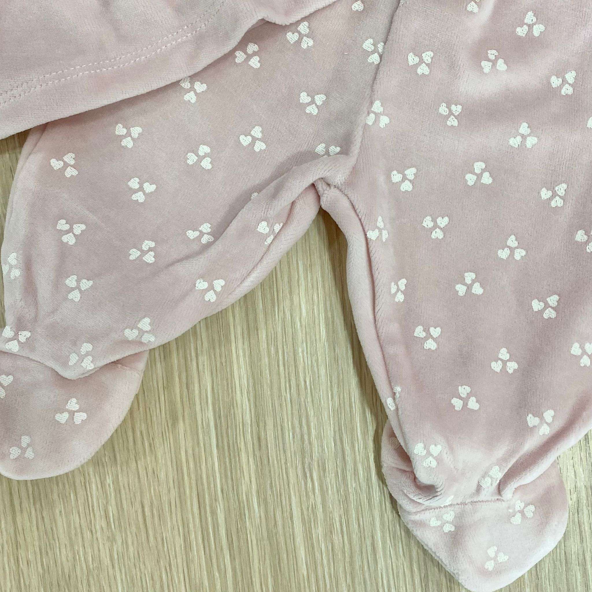 Vestina due pezzi neonata in ciniglia, di colore rosa, con stampa di cuoricini di colore bianco. Clinico con applicazione di fiorellini in organza.