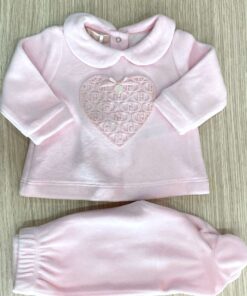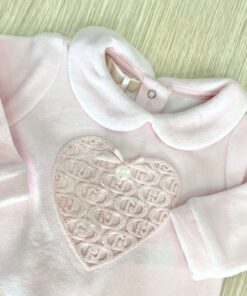 Vestina due pezzi neonata in ciniglia, di colore rosa, con dettaglio di cuoricino con logo LIU•JO in rilievo e applicazione di fiocchetto.