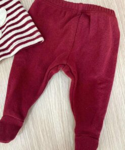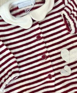 Vestina due pezzi neonata in caldo cotone, di colore rosso scuro e panna, con applicazione di cuoricini in rilievo.