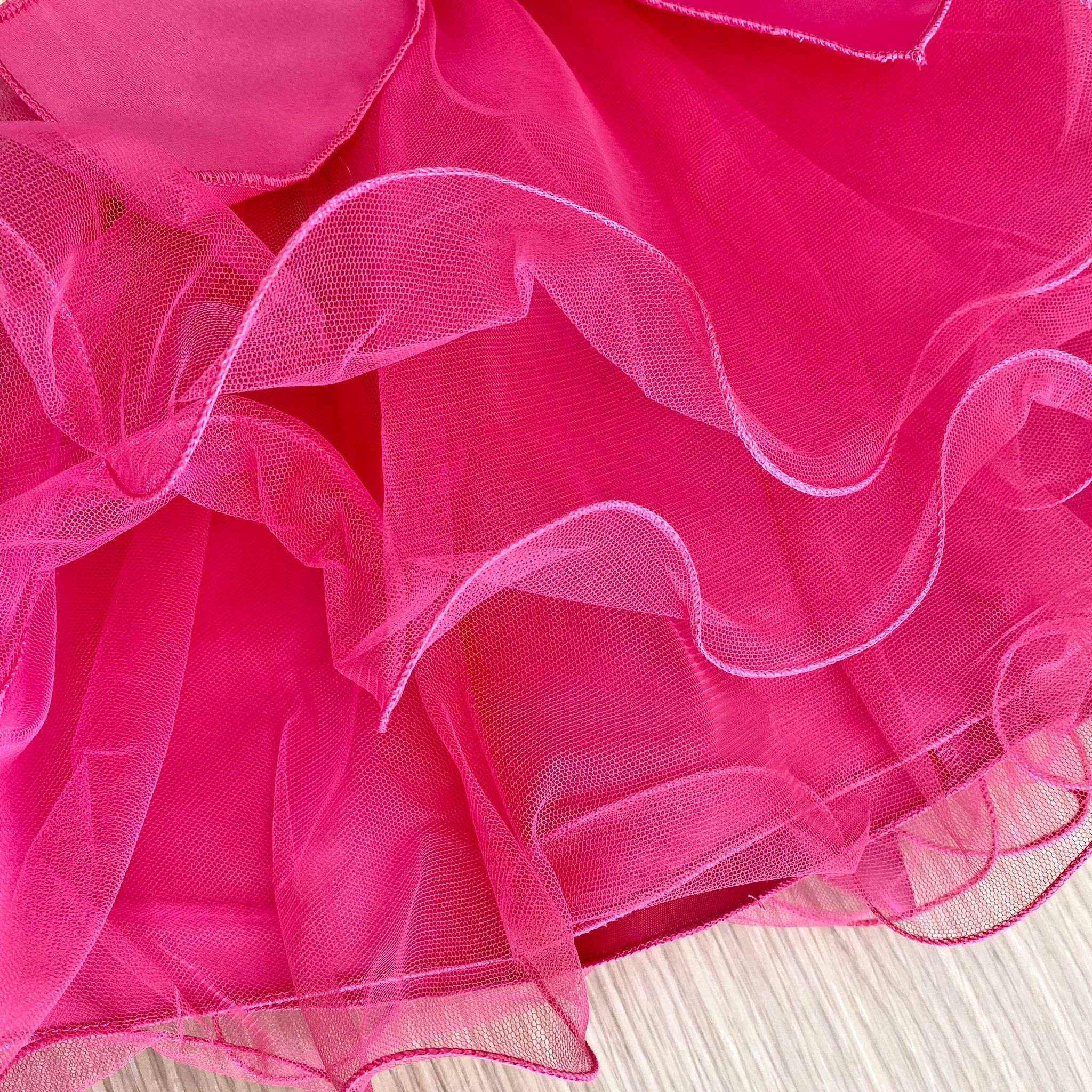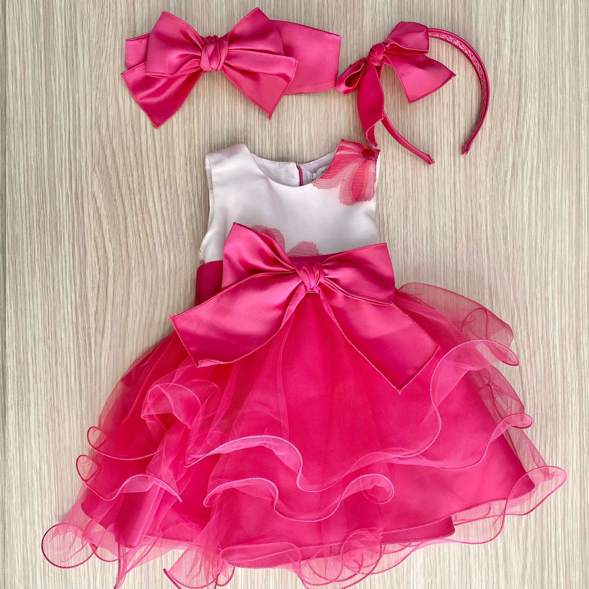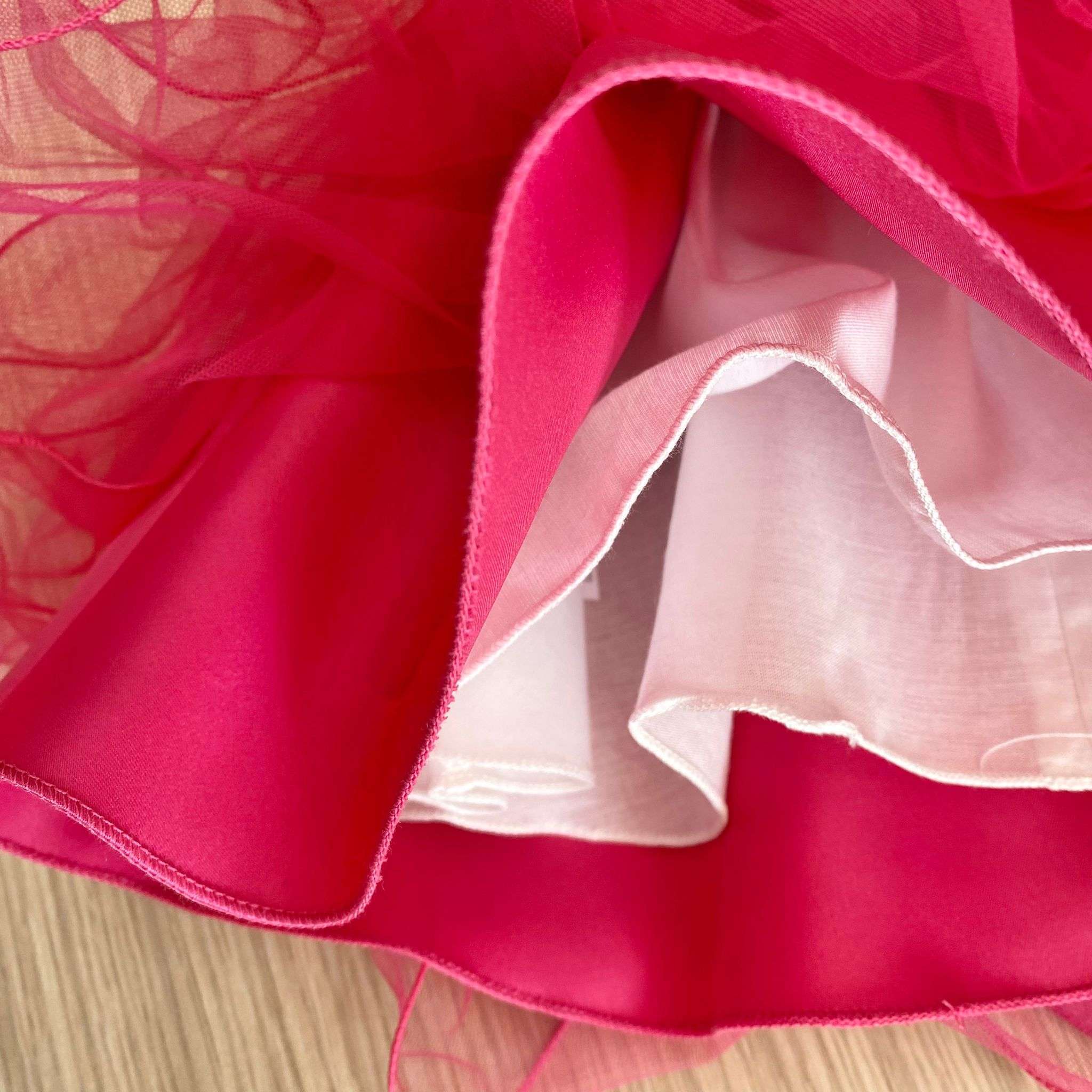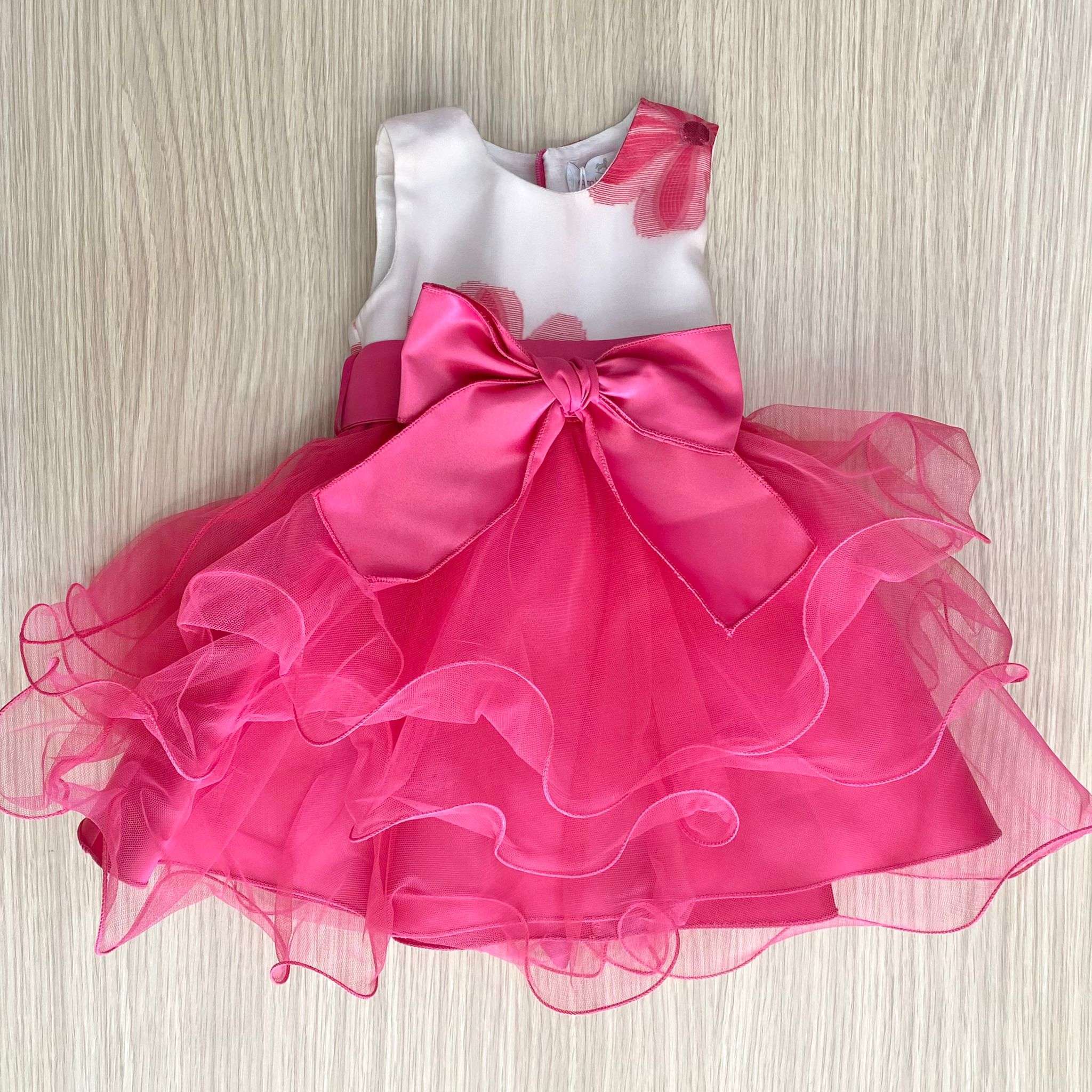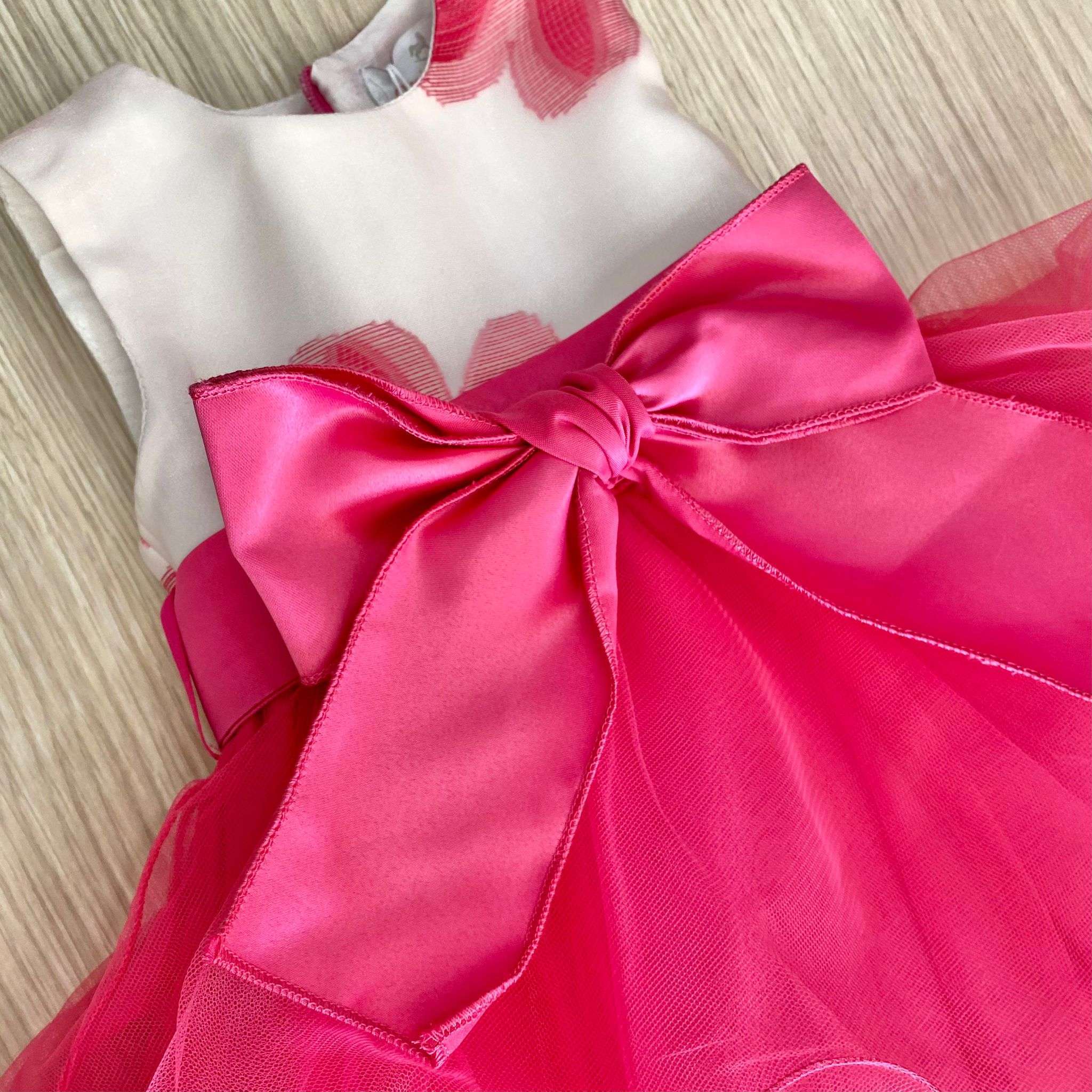 Vestina bambina elegante in cotone rasato, di colore bianco e fucsia, con balze in tulle. Vestina con applicazione di fiocco in raso. Vestina con corpetto stampe di fiori in cotone rasato. Vestina con fodera in cotone.