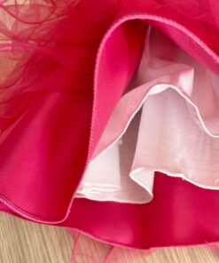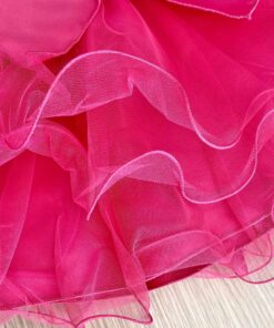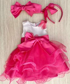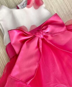 Vestina bambina elegante in cotone rasato, di colore bianco e fucsia, con balze in tulle. Vestina con applicazione di fiocco in raso. Vestina con corpetto stampe di fiori in cotone rasato. Vestina con fodera in cotone.