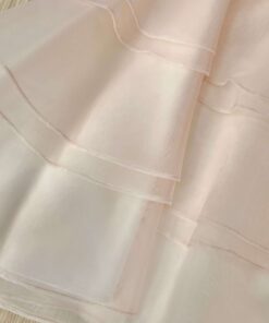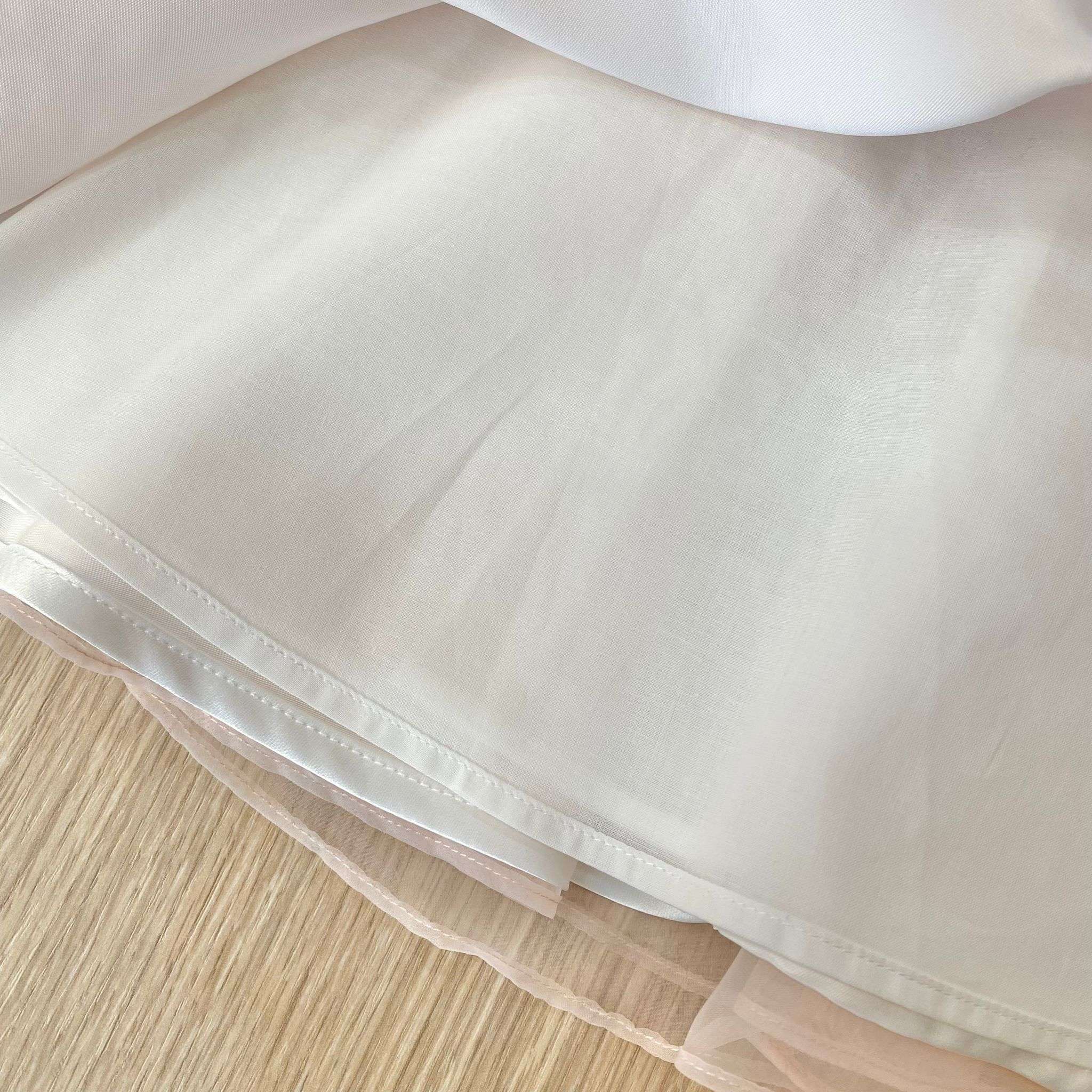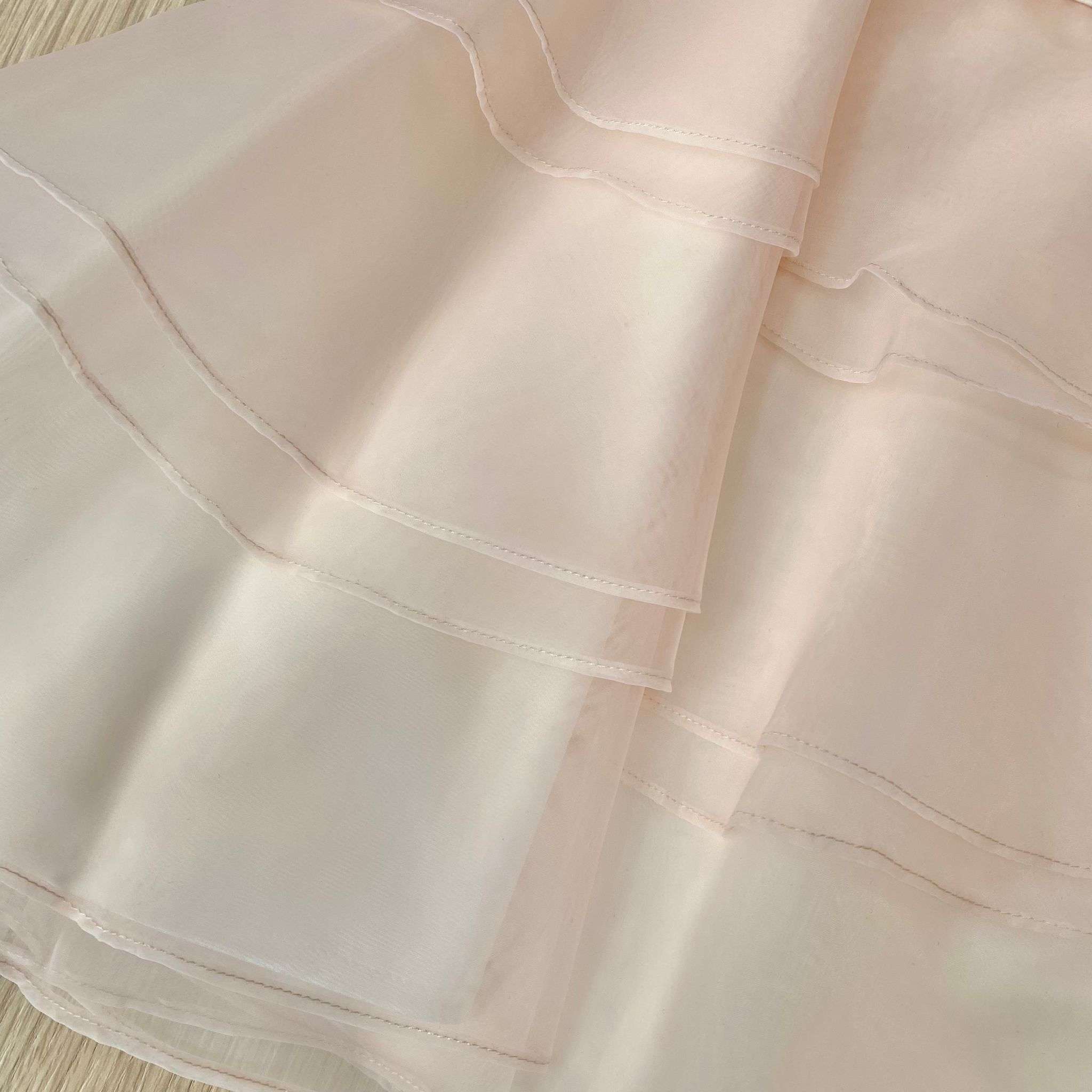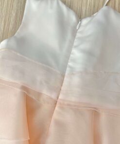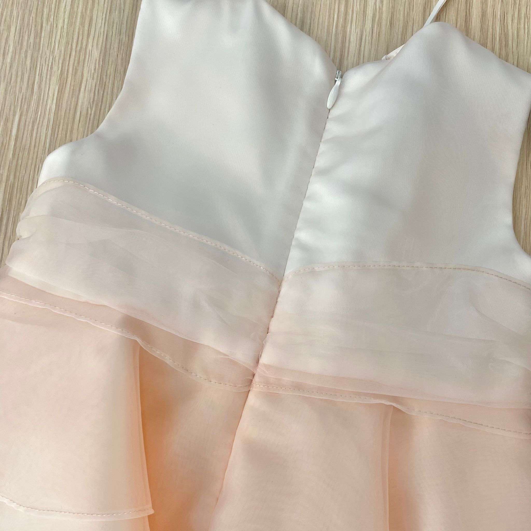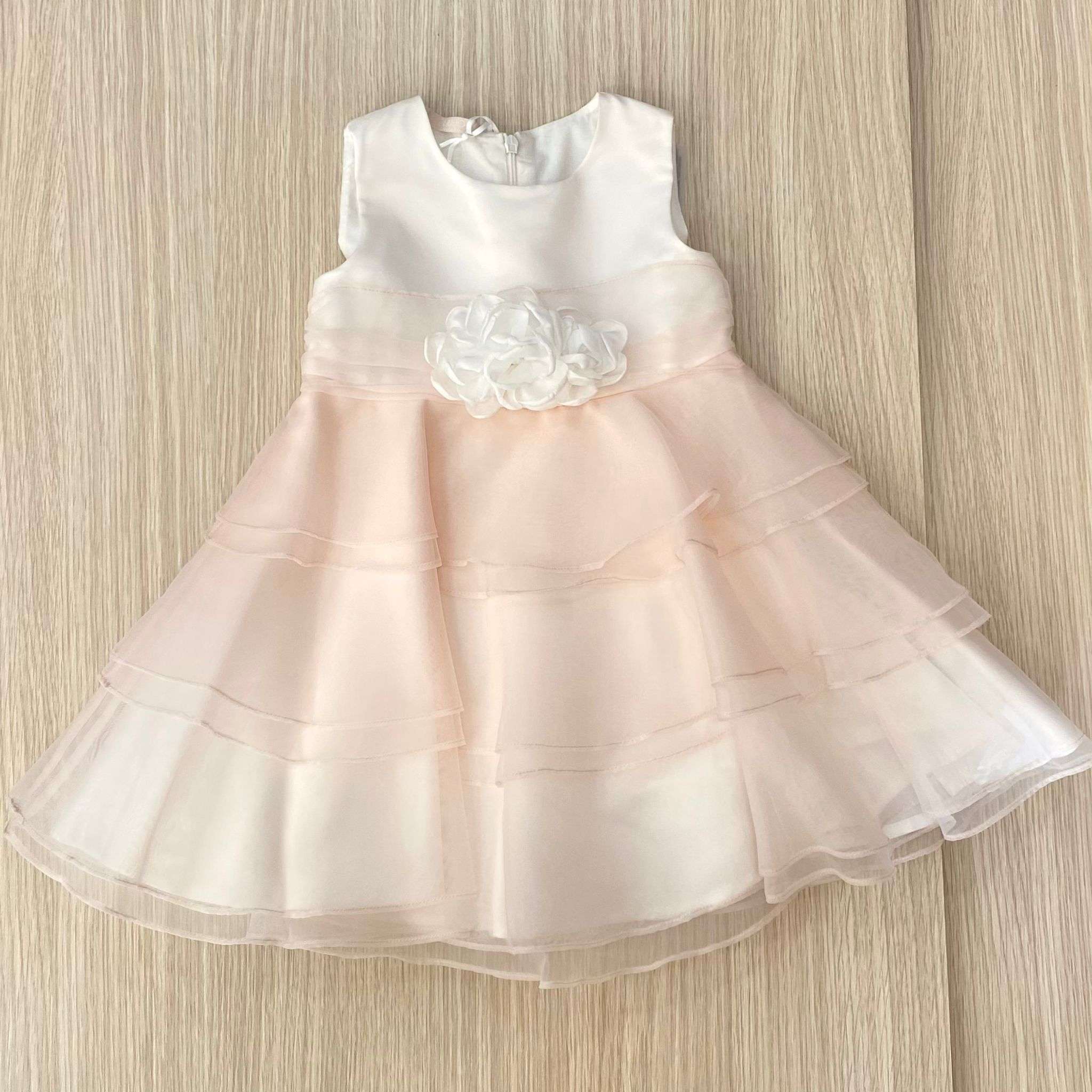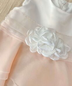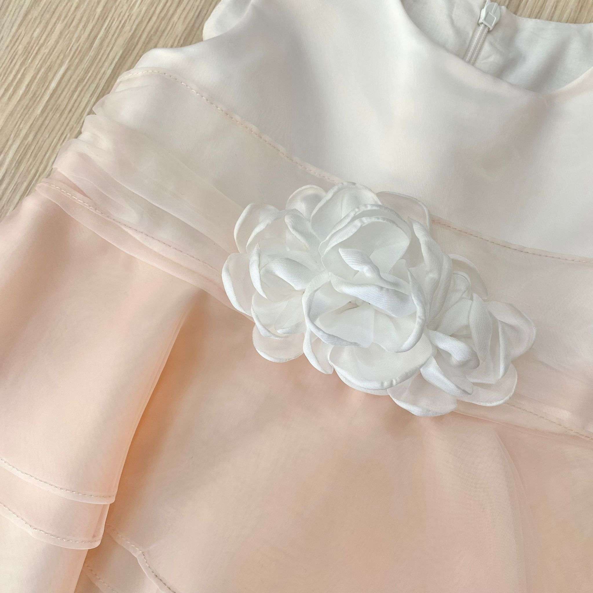 Vestina elegante bambina scamiciata con balza in tulle rosa, con finta cintura in vita e applicazione di fiorellino con petali in organza di colore bianco.