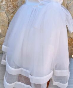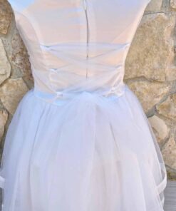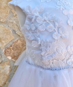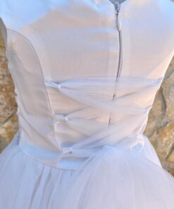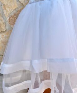 Vestina bambina elegante in morbido tessuto, di colore bianco, con volant in tulle e corpetto dettagli in rilievo, e applicazione di strass.