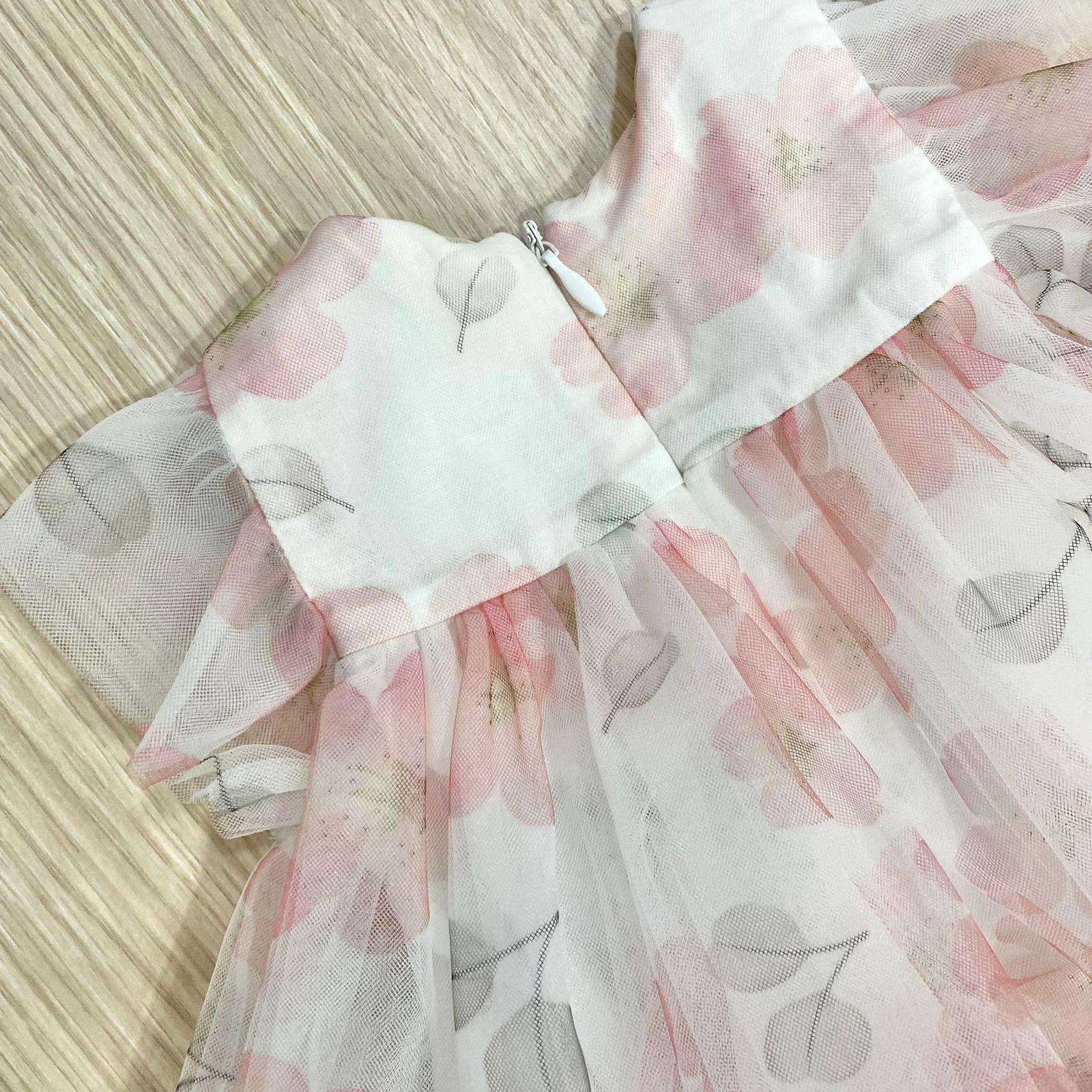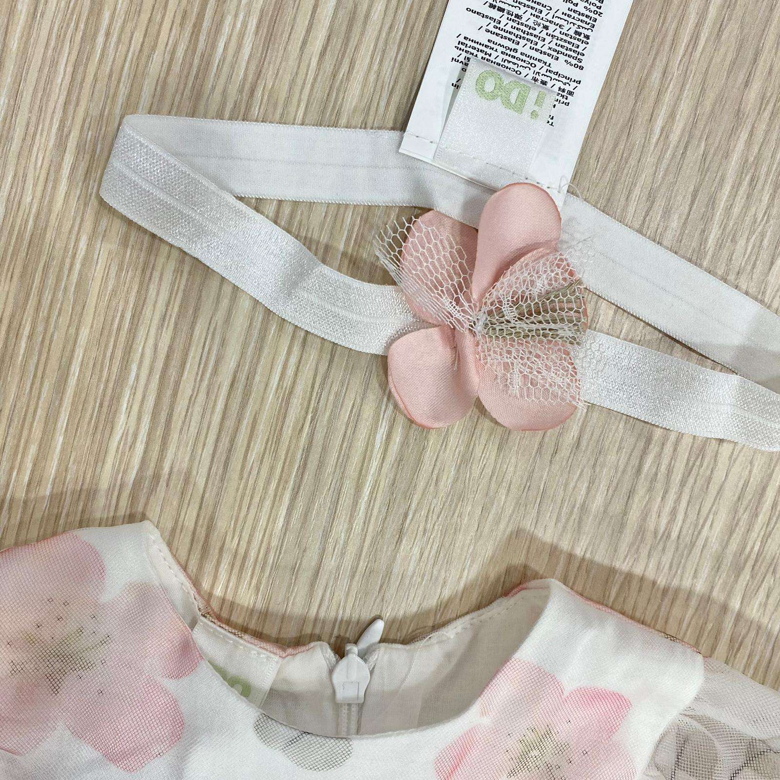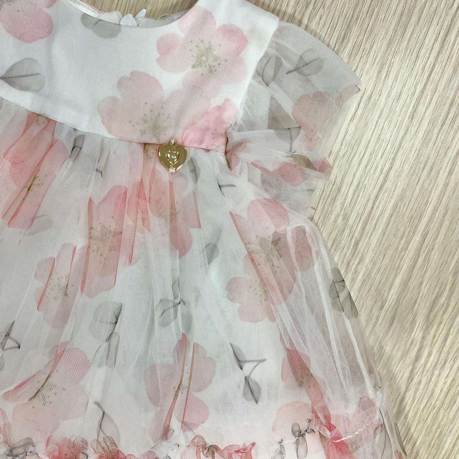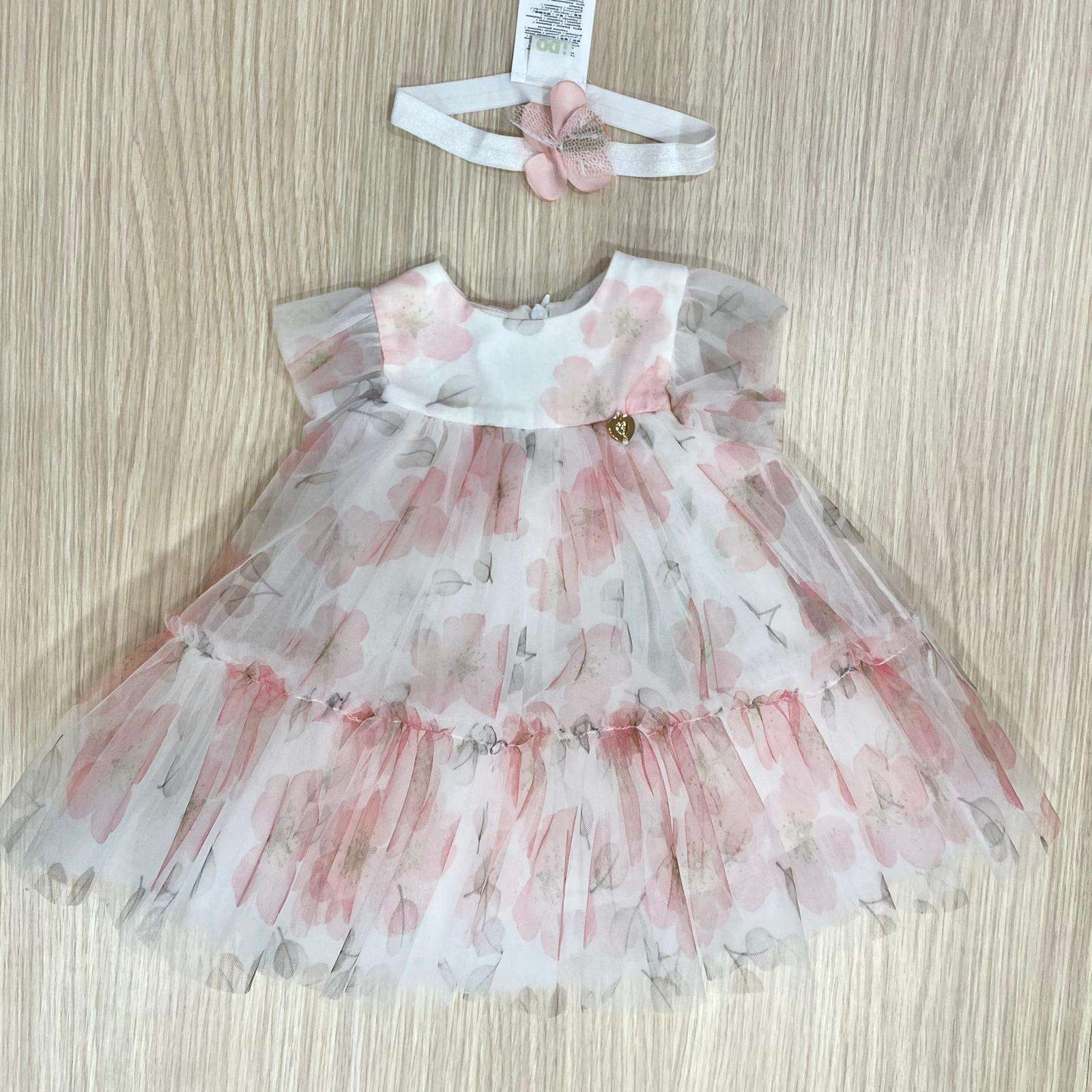 Vestina elegante con fascettta neonata/bambina di colore rosa e panna, in tulle, con disegni floreali. Vestina con vari starti di tulle, applicazione di cuoricino dorato e brillantino.