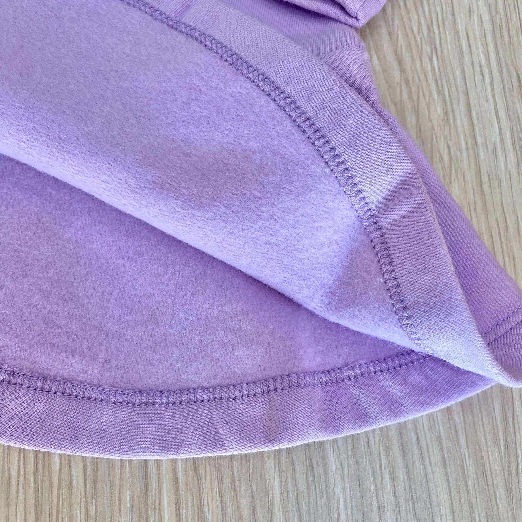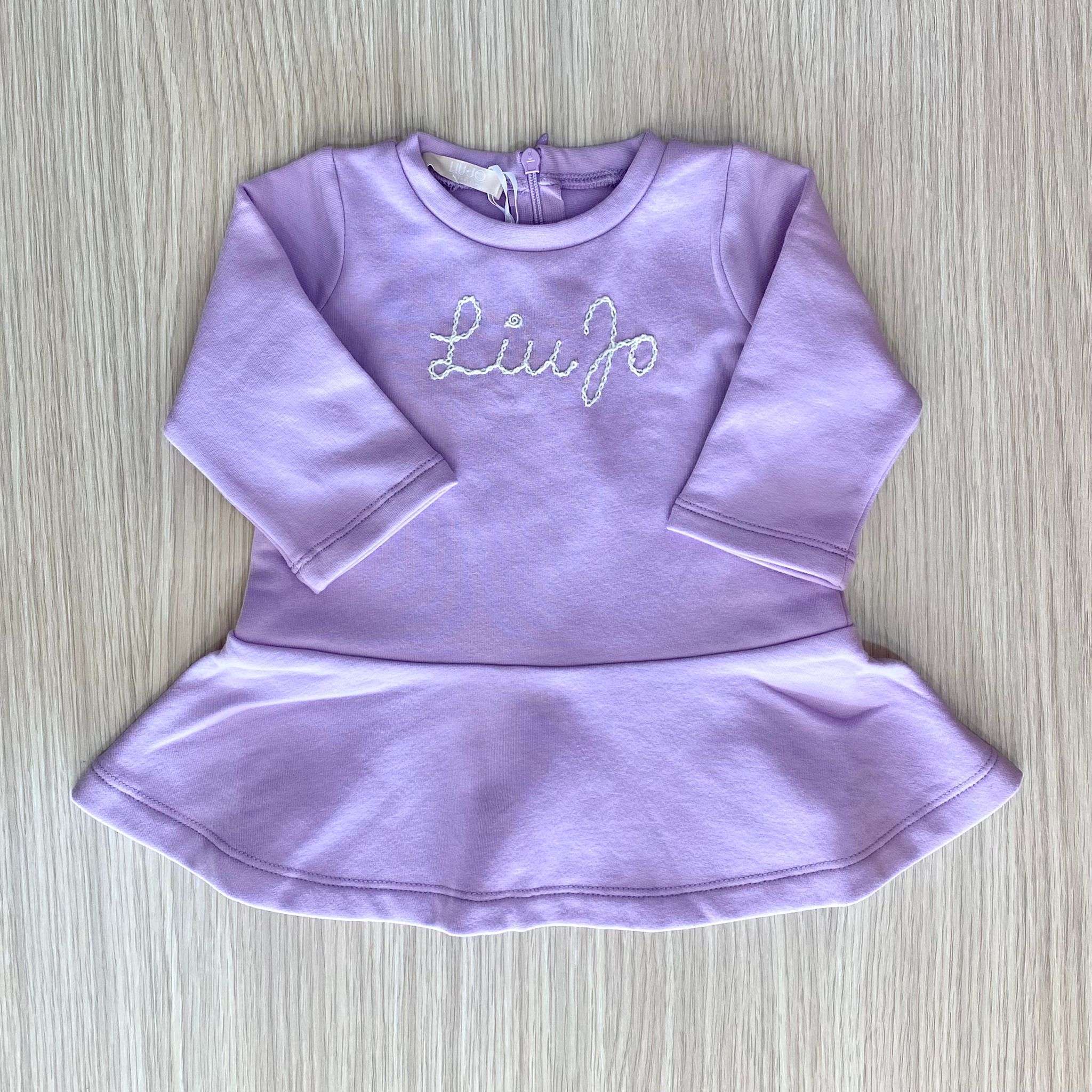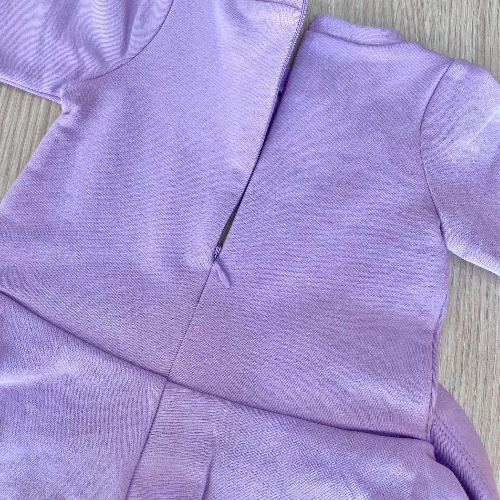 Vestitino neonata/bambina in cotone felpato, di colore glicine, con marchio ricamato, chiusura con cerniera.