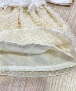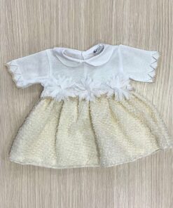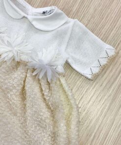 Vestitino mezza manica neonata in filo di scozia, di colore bianco e beige e applicazione di fiorellini in organza e dettagli in lurex di cotone.