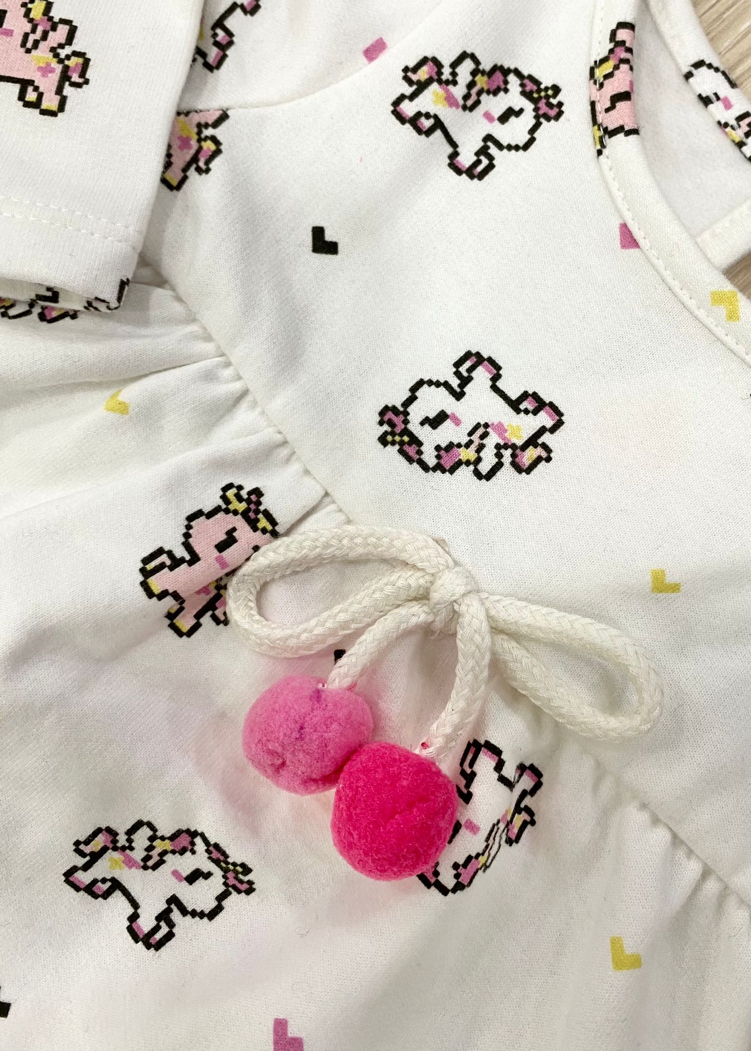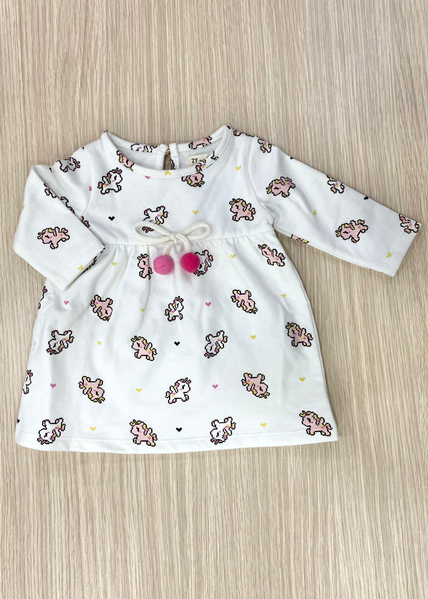 Vestitino neonata/bambina, in cotone felpato, di colore bianco, con stampa unicorni di vari colori, con applicazione di laccetto regolabile in vita e pompon.
