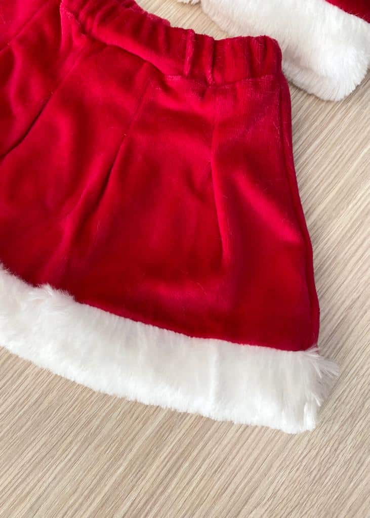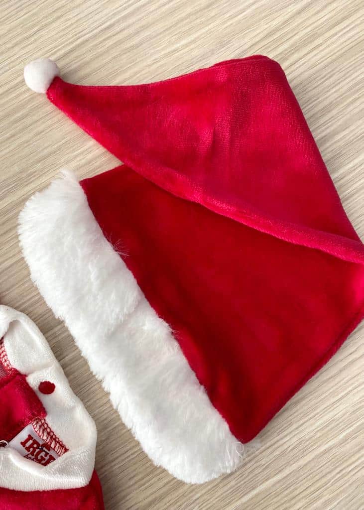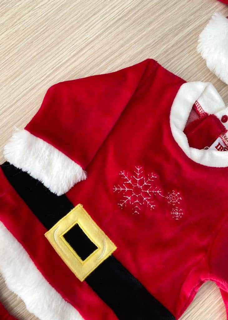 Vestito/costume due pezzi con cappellino Mamma Natale in morbida ciniglia di cotone di colore rosso con dettaglio di finta cintura di colore nero e morbida ciniglia di colore bianco.