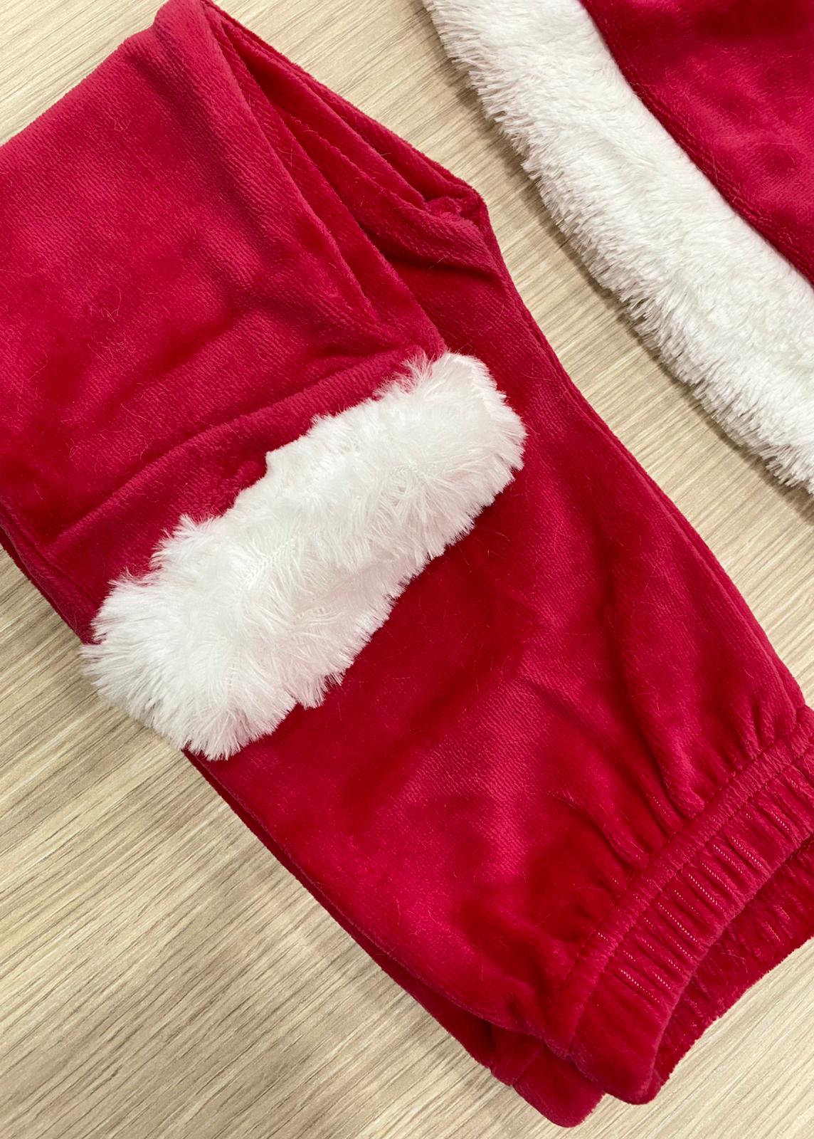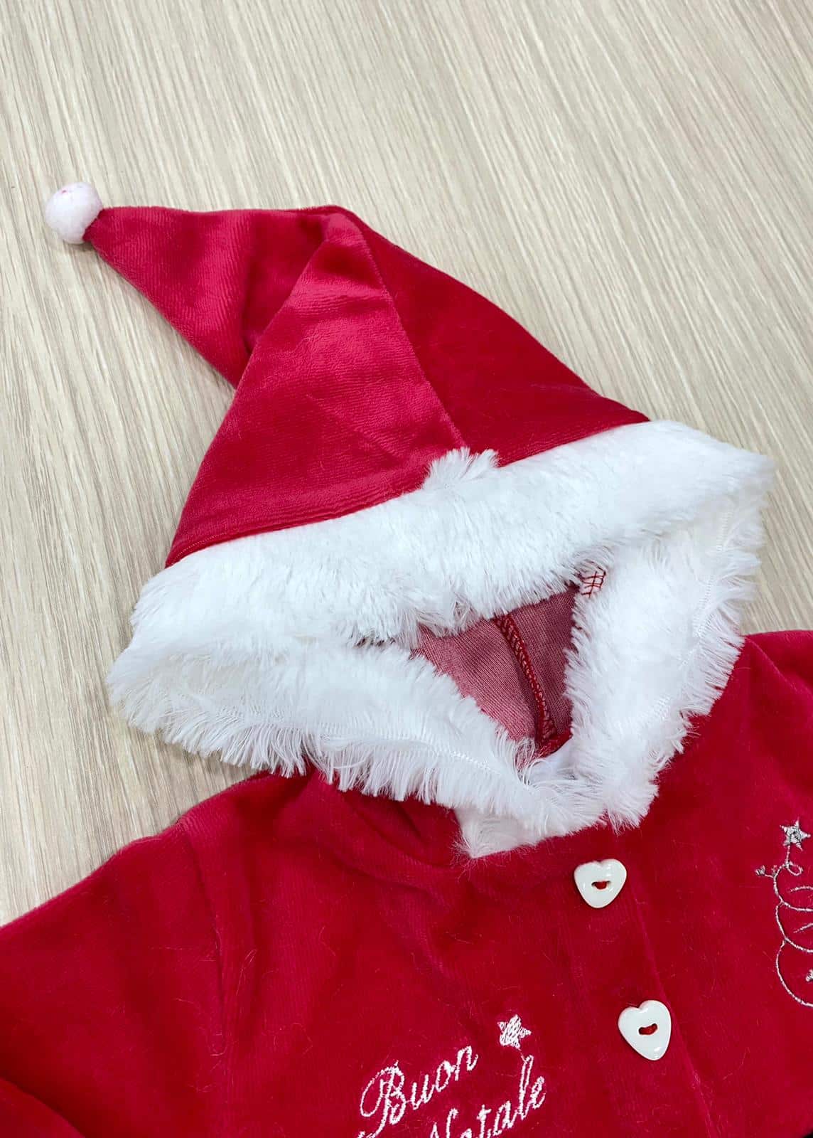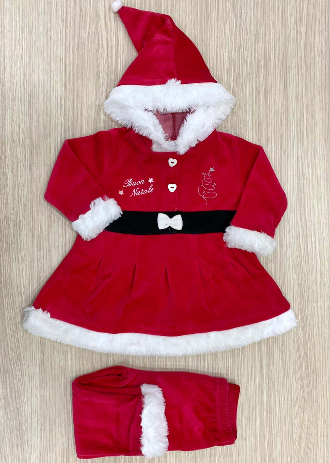 Vestito/costume due pezzi con cappellino Mamma Natale in morbida ciniglia di cotone di colore rosso con dettaglio di finta cintura di colore nero e morbida ciniglia di colore bianco.