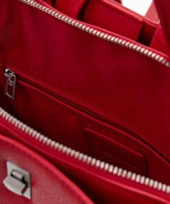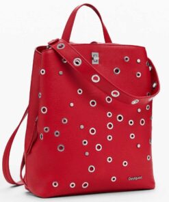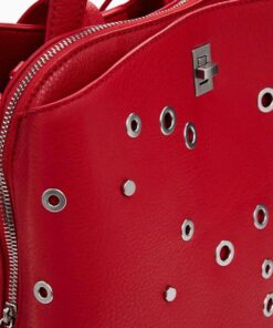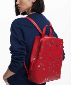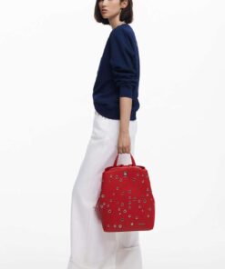 Zaino medio in tessuto effetto pelle, manico rimovibile, vari scomparti interni, dettagli di borchie metalliche in colore uniforme.